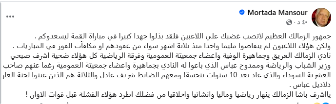 واختتم منصور رسالته بالقول: "يا أشرف باشا، الزمالك ينهار رياضيًا وماليًا وإنشائيًا وأخلاقيًا، من فضلك اطرد هؤلاء الفشلة قبل فوات الأوان".