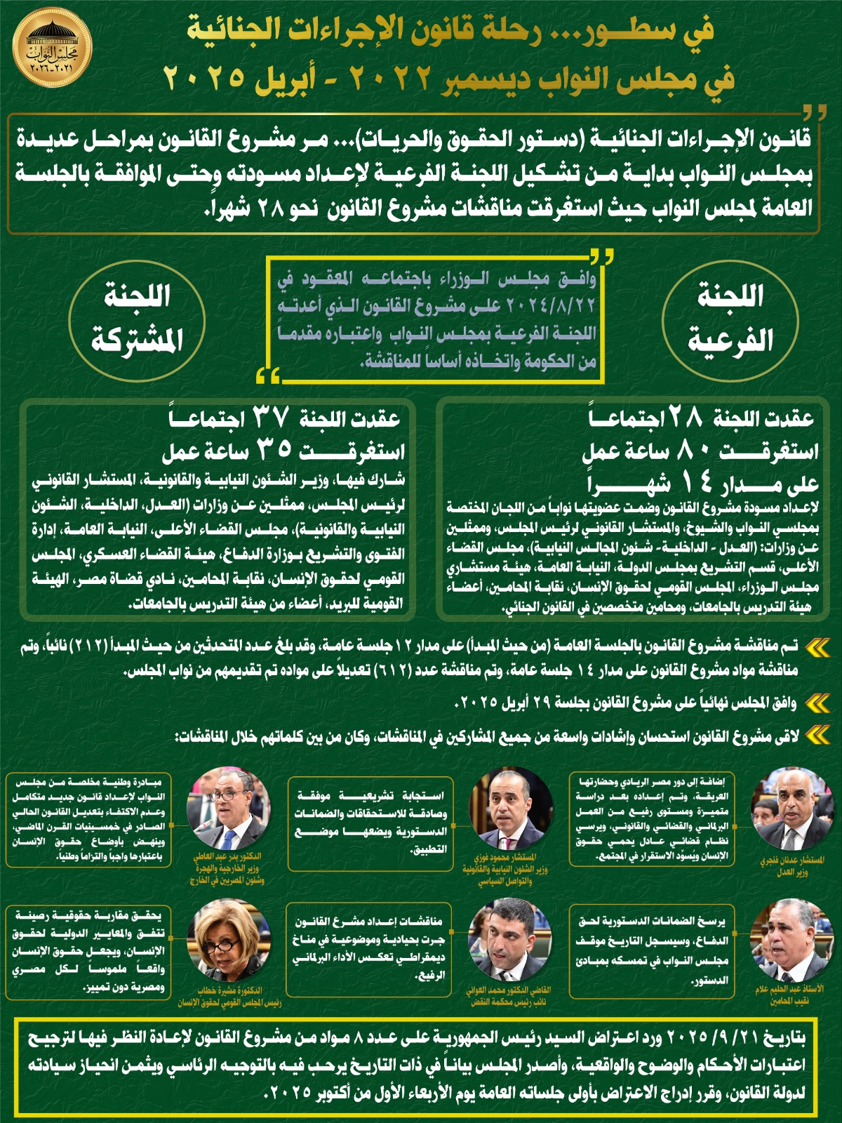 - عقدت اللجنة الفرعية ٢٨ اجتماعــاً، استغرقــــت ٨٠ ساعة عمل، على مــــدار ١٤ شهـــــــراً، لإعداد مسودة مشروع القانون، وضمت عضويتها نواباً من اللجان المختصة بمجلسي النواب والشيوخ، والمستشار القانوني لرئيس المجلس، وممثلين عن وزارات: (العدل - الداخلية- شئون المجالس النيابية)، مجلس القضاء الأعلى، قسم التشريع بمجلس الدولة، النيابة العامة، هيئة مستشاري مجلس الوزراء، المجلس القومي لحقوق الإنسان، نقابة المحامين، أعضاء هيئة التدريس بالجامعات، ومحامين متخصصين في القانون الجنائي.