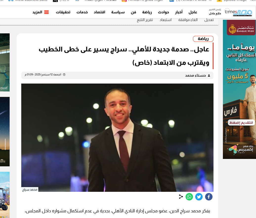 وكان قد نشر “مصر تايمز” خبرًا تحت عنوان(صدمة جديدة للأهلي.. سراج يسير على خطى الخطيب ويقترب من الابتعاد (خاص)