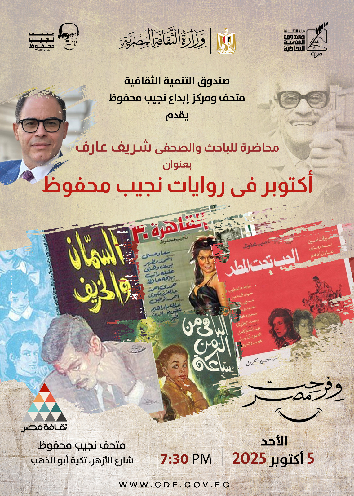 في إطار فعاليات وأنشطة متحف ومركز إبداع نجيب محفوظ، بتكية محمد أبو الدهب، التابع لصندوق التنمية الثقافية، برئاسة المعمارى حمدى السطوحى، واحتفاء بالذكرى الـ ٥٢ لحرب أكتوبر ١٩٧٣، يلقى فى السابعة من مساء الأحد القادم "٥ أكتوبر" الباحث والصحفى شريف عارف، محاضرة بعنوان "أديب المؤرخين.. ومؤرخ الأدباء.. قراءة تاريخية فى محطاته الروائية"، متوقفا عند التطور التاريخي فى أدب نجيب محفوظ، منذ روايته كفاح طيبة وحتى الثلاثية، كما يرصد أبرز المحطات التى انعكست فيها الأحداث التاريخية فى: السمان والخريف، الحرب تحت المطر، الباقى من الزمن ساعة، وينهى هذه المحاضرة بالتركيز على آراء نجيب محفوظ فى حرب أكتوبر.