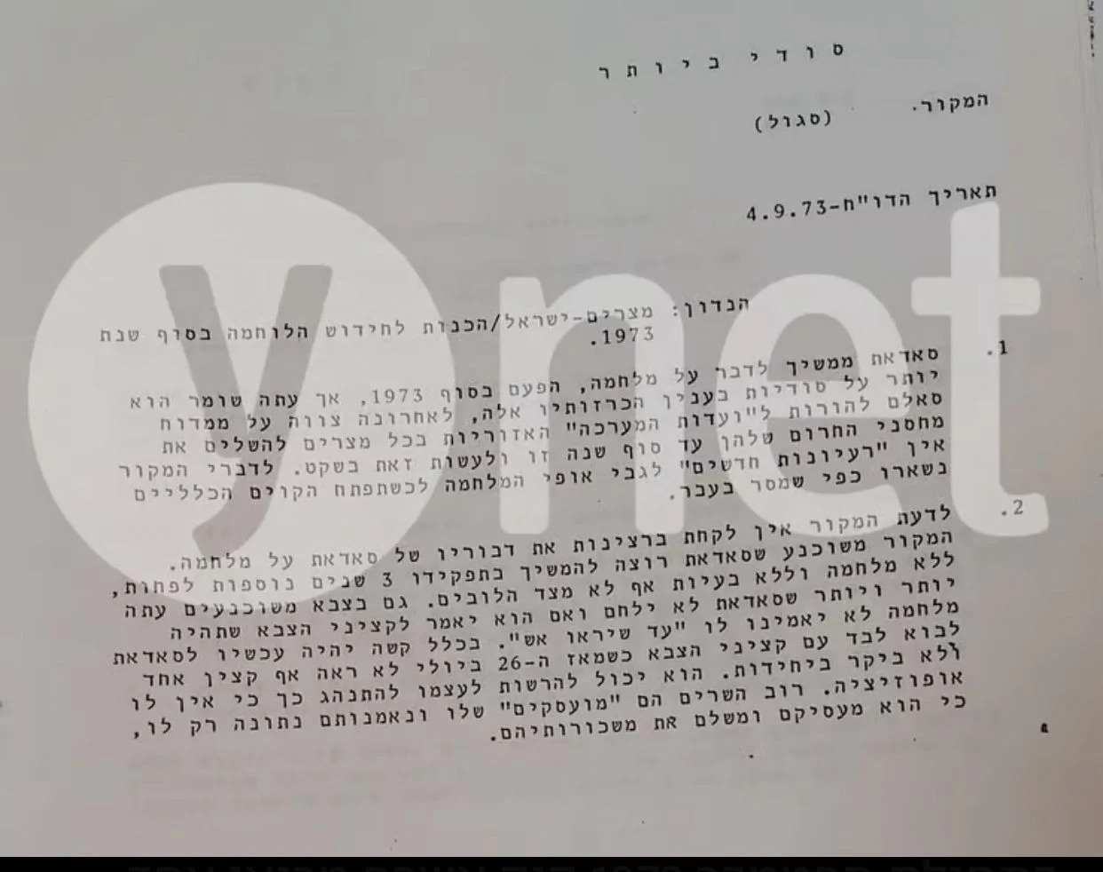 ونشرت الصحيفة الإسرائيلية عددا من الوثائق التي قدمها جهاز الموساد نقلا عن أشرف مروان منها رسالة بعنوان "مصر وإسرائيل .. الاستعدادات لتجدد الأعمال العدائية نهاية 1973"، مؤكدة أن هذا التقرير الذي أرسله أشرف مروان إلى الموساد في 4 سبتمبر 1973 بأن الرئيس أنور السادات يواصل الحديث عن أن الحرب في نهاية عام 1973، لكنه الآن أكثر تكتمًا بشأن هذا الأمر، ويقول مروان في البرقية التي أرسلت للموساد: السادات أمر مؤخرًا ممدوح سالم – وزير الداخلية آنذاك - بإصدار تعليمات لاستكمال مخازن الطوارئ الخاصة بها بحلول نهاية 1973 والقيام بذلك بهدوء".