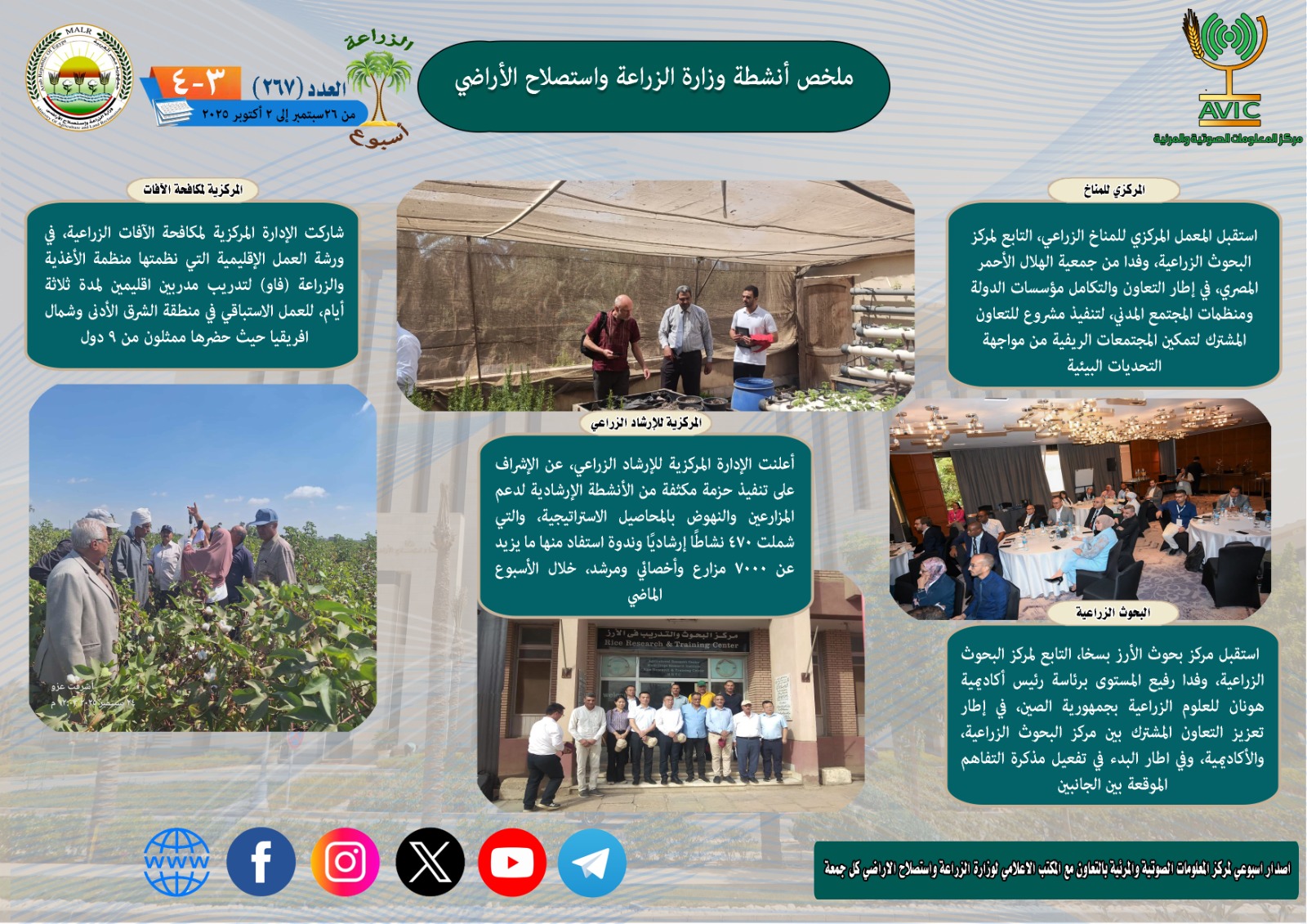 واستقبل مركز بحوث الأرز بسخا، التابع لمركز البحوث الزراعية، وفدا رفيع المستوى برئاسة رئيس أكاديمية هونان للعلوم الزراعية بجمهورية الصين، في إطار تعزيز التعاون المشترك بين مركز البحوث الزراعية، والأكاديمية، وفي اطار البدء في تفعيل مذكرة التفاهم الموقعة بين الجانبين، كما شاركت الإدارة المركزية لمكافحة الآفات الزراعية، في ورشة العمل الإقليمية التي نظمتها منظمة الأغذية والزراعة (فاو) لتدريب مدربين اقليمين لمدة ثلاثة أيام، للعمل الاستباقي في منطقة الشرق الأدنى وشمال افريقيا حيث حضرها ممثلون من 9 دول.