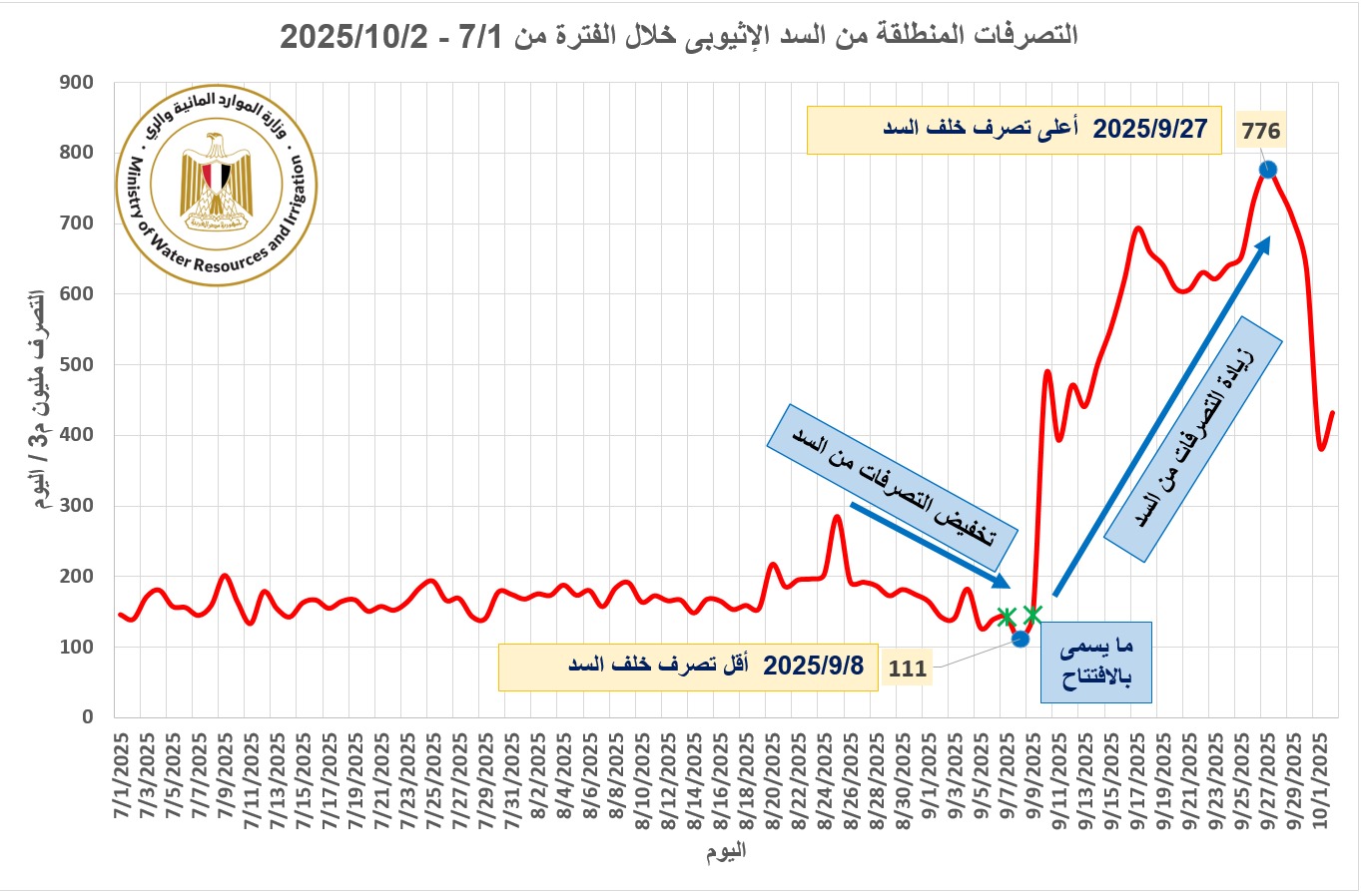 4. غير أنه في نهاية أغسطس لوحظ أن مشغلي السد الإثيوبي خالفوا القواعد الفنية والعلمية المتعارف عليها، حيث قاموا بتخزين كميات أكبر من المتوقع من مياه الفيضان مع تقليل التصريفات من نحو 280 مليون م³ إلى 110 ملايين م³ يوم 8 سبتمبر 2025. وتدل هذه التصرفات على توجه إثيوبي متعجل نحو إتمام الملء بصورة غير منضبطة، بغرض الوصول إلى منسوب 640 متر فوق سطح البحر، ثم فتح المفيض الأوسط ومفيض الطوارئ لساعات معدودة لاستخدامها فقط كـ"لقطة إعلامية" واستعراض سياسي في ما سُمّي باحتفال افتتاح السد يوم 9 سبتمبر 2025، بعيداً عن أي اعتبار للسلامة المائية أو مصالح دول المصب.