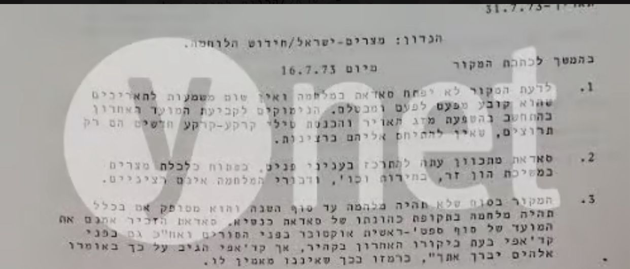 نشرت صحيفة يديعوت أحرونوت الإسرائيلية عددا من الوثائق السرية حول حرب أكتوبر 1973 بمناسبة مرور 52 عاما على اندلاعها، مؤكدة أن هذه الوثائق تكشف مدى تلاعب الجانب المصري بإسرائيل وقادتها عبر أشرف مروان الذي لعب دورا هاما في خطة الخداع الاستراتيجي المصرية ضد إسرائيل خلال حرب 1973 أو ما يطلق عليها في إسرائيل "حرب يوم الغفران".