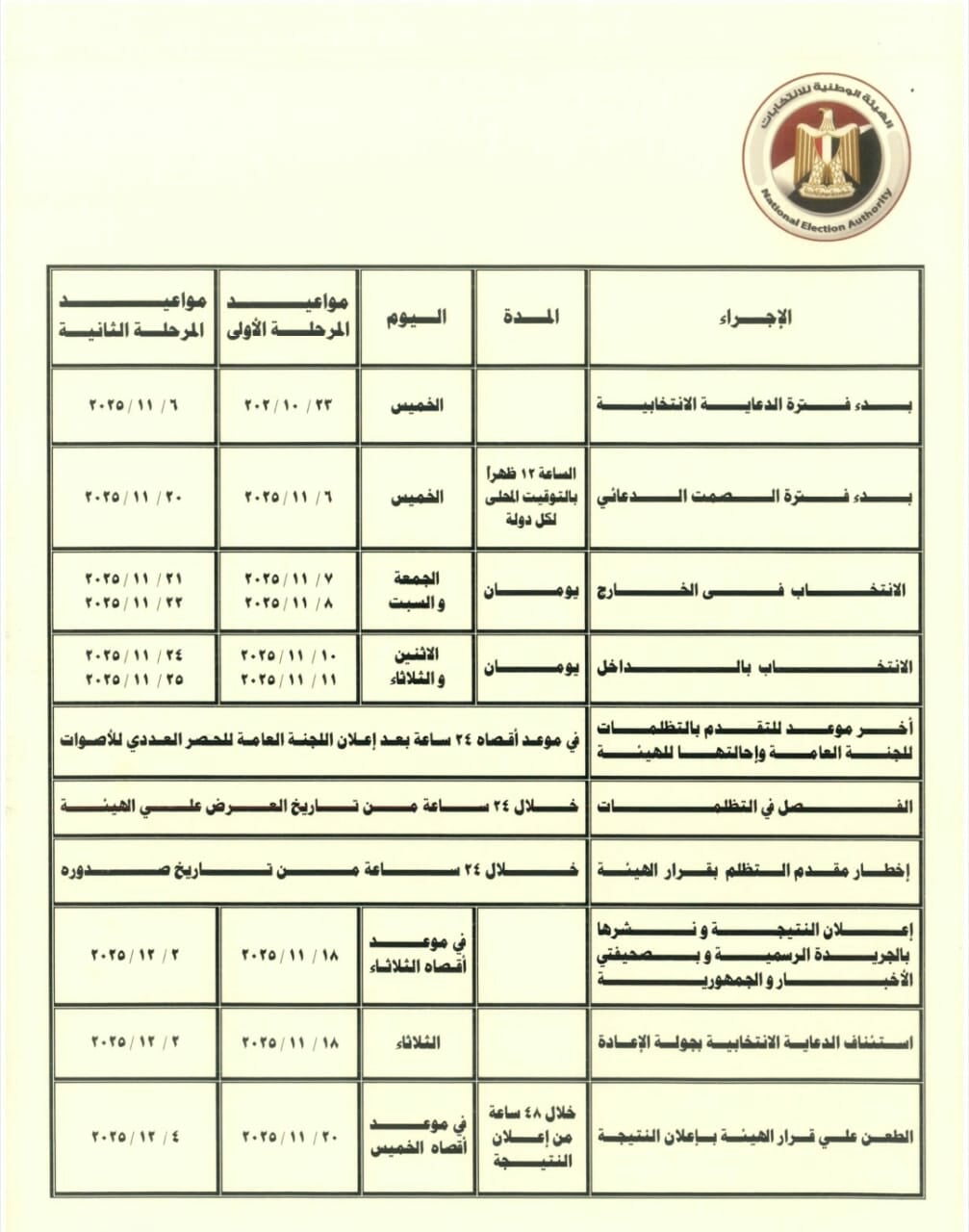 تبدأ فترة الدعاية الانتخابية للمرحلة الأولى من 23 أكتوبر حتى 6 نوفمبر، يليها مباشرة الصمت الانتخابي.