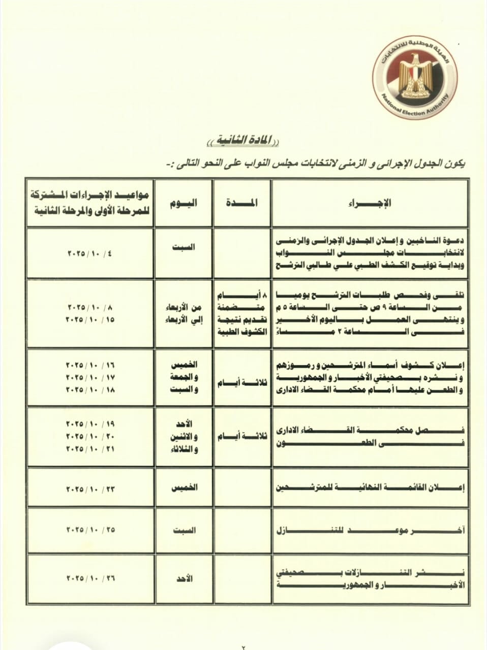 أوضح المستشار بدوي أن كشف أسماء المرشحين للمرحلتين سيُعلن يوم 16 أكتوبر، فيما ستنظر محكمة القضاء الإداري في الطعون بين 19 و21 أكتوبر، على أن يتم الإعلان عن القوائم النهائية يوم 23 أكتوبر. وأكد أن آخر موعد للتنازل عن الترشح هو 25 أكتوبر.