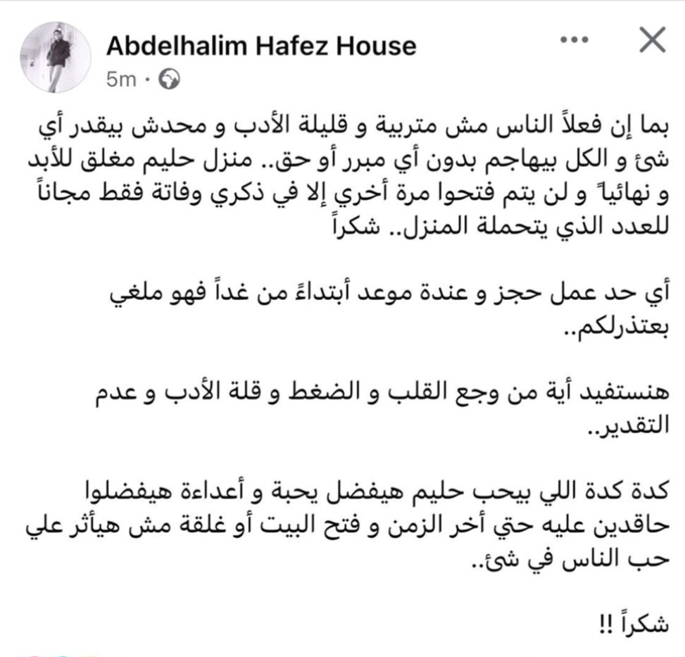 وقالت أسرة عبد الحليم حافظ، من خلال حسابها الرسمي عبر موقع التواصل الاجتماعي فيسبوك، كتبت : "بما إن فعلاً الناس مش متربية و قليلة الأدب و محدش بيقدر أي شئ و الكل بيهاجم بدون أي مبرر أو حق.. منزل حليم مغلق للأبد ونهائياً و لن يتم فتحوا مرة أخري إلا في ذكري وفاتة فقط مجاناً للعدد الذي يتحملة المنزل.. شكراً".