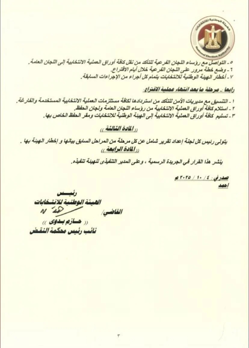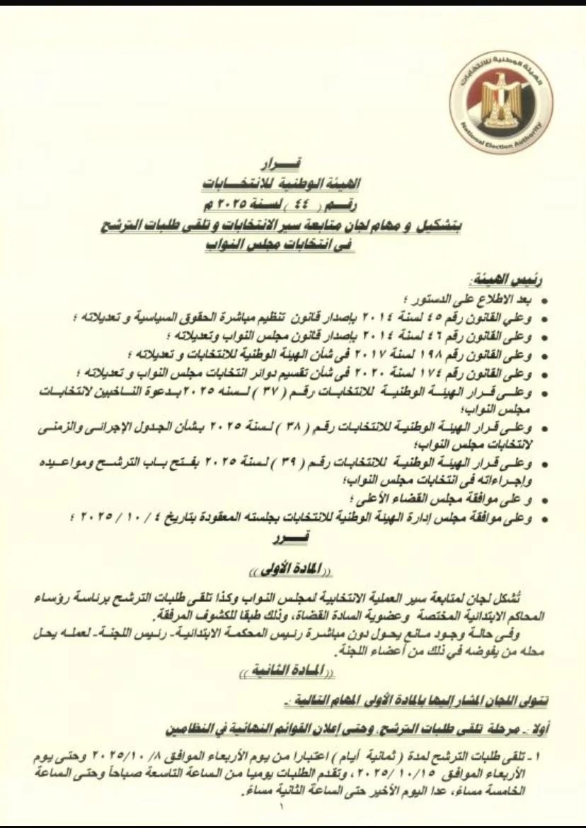 أصدرت الهيئة الوطنية للانتخابات برئاسة القاضى حازم بدوى، القرار رقم 44 لسنة 2025 بتشكيل لجان ومهام متابعة سير الانتخابات وتلقى طلبات الترشح فى انتخابات مجلس النواب.