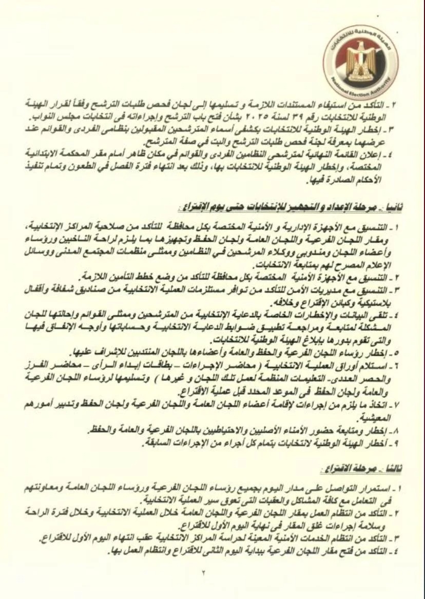 2- التأكد من استيفاء المستندات اللازمة وتسليمها إلى لجان فحص طلبات الترشح وفقاً لقرار الهيئة الوطنية للانتخابات رقم 39 لسنة 2025 بشأن فتح باب الترشح وإجراءاته في انتخابات مجلس النواب.