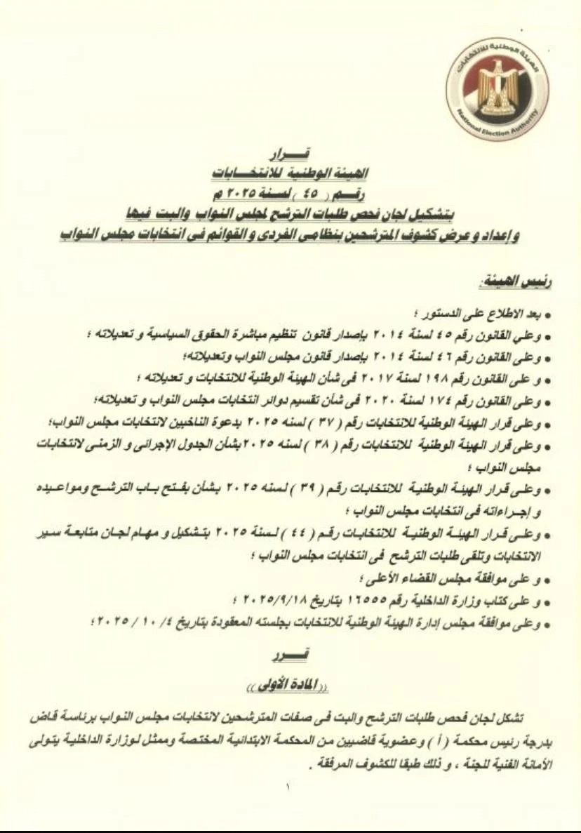 وتضمن القرار رقم 45 لسنة 2025 أن تتولى هذه اللجان فحص طلبات الترشح والبت في صفات المترشحين من واقع المستندات المقدمة للترشح، وإعداد كشوف المترشحين والقوائم المقبولة وعرضها في اليوم التالي لإقفال باب الترشح.