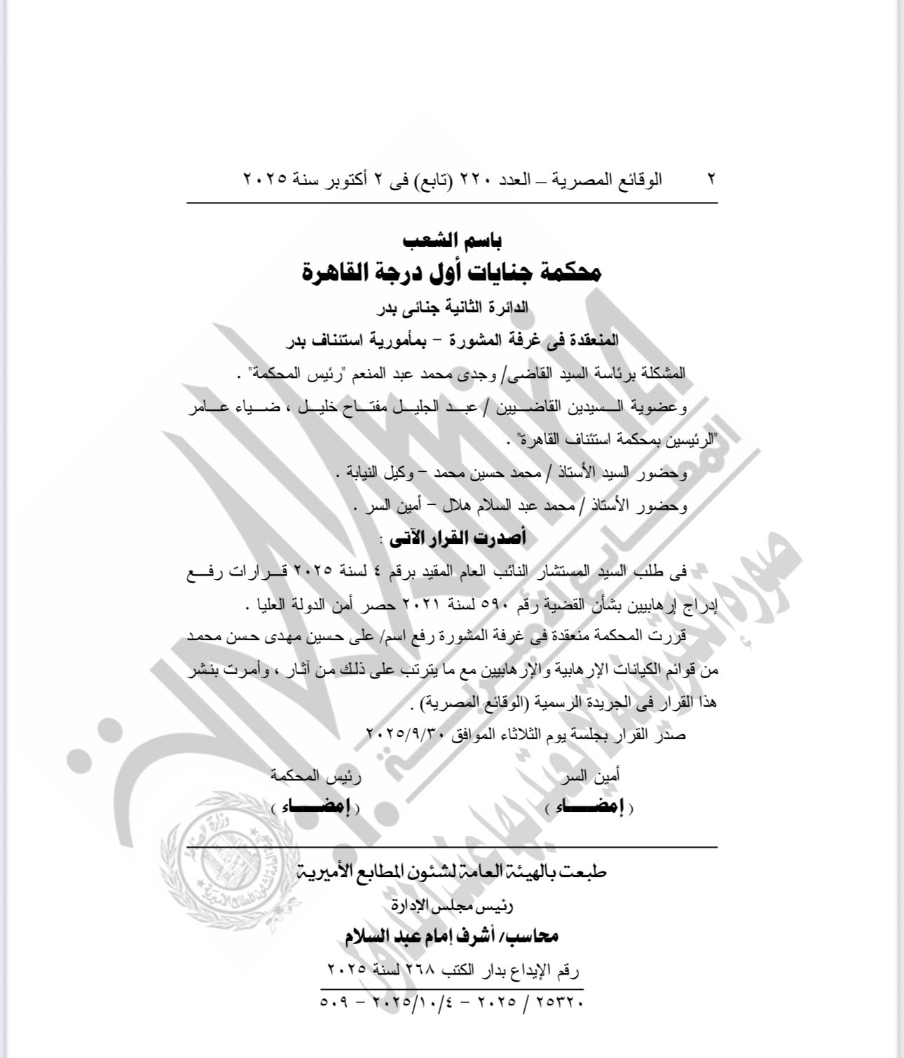 نشرت الجريدة الرسمية، قرار المحكمة منعقدة في غرفة المشورة، برفع أسم علي حسين مهدي حسن محمد من قوائم الكيانات الإرهابية والإرهابيين مع ما يترتب على ذلك من آثار.
