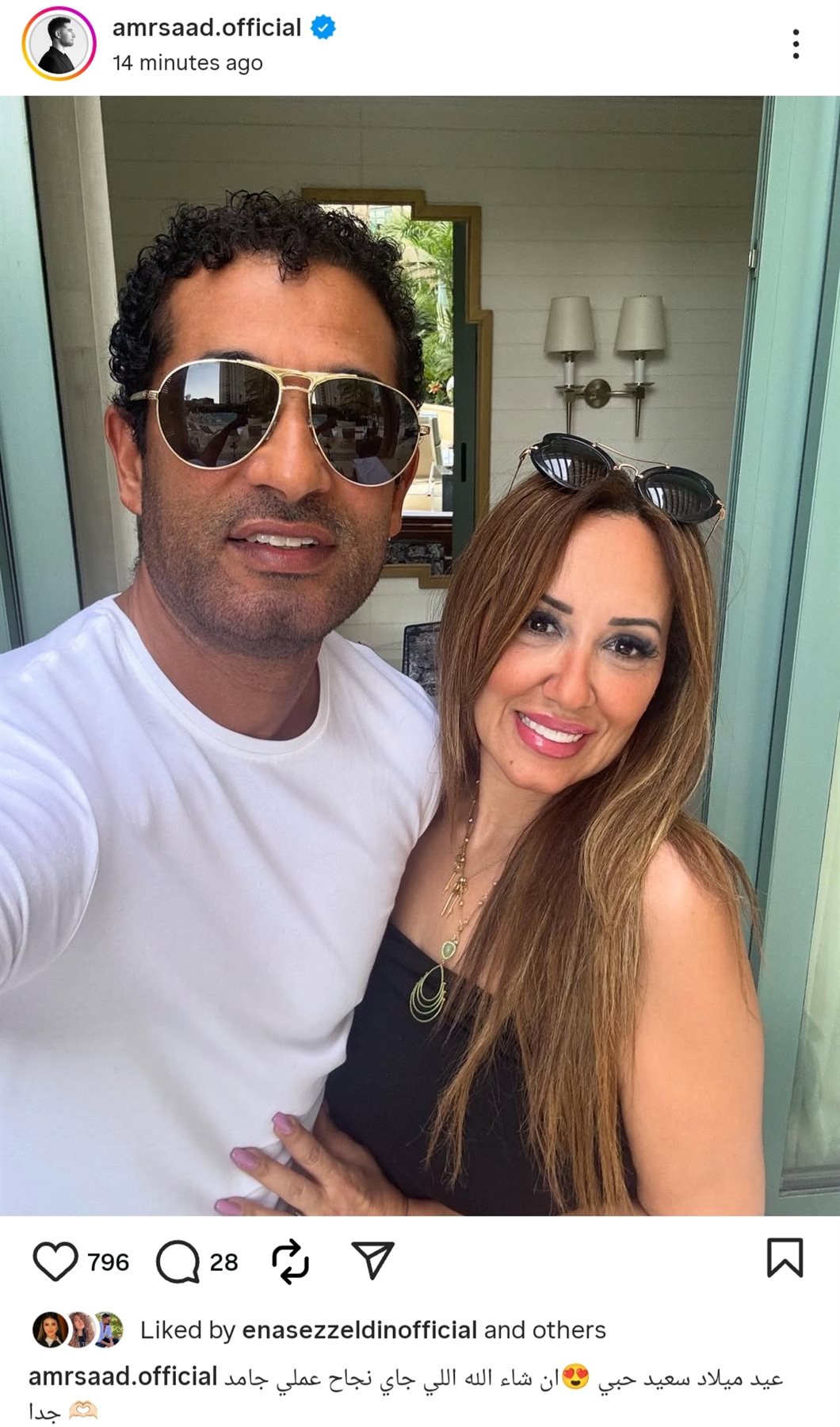 ونشر عمرو سعد صورة جمعته بزوجته، ووجه لها كلمات رومانسية، من خلال حسابه الرسمي عبر موقع تبادل الصور والفيديوهات القصيرة إنستجرام، وكتب: "عيد ميلاد سعيد حبي.. إن شاء الله اللي جاي نجاح عملي جامد جدًا".