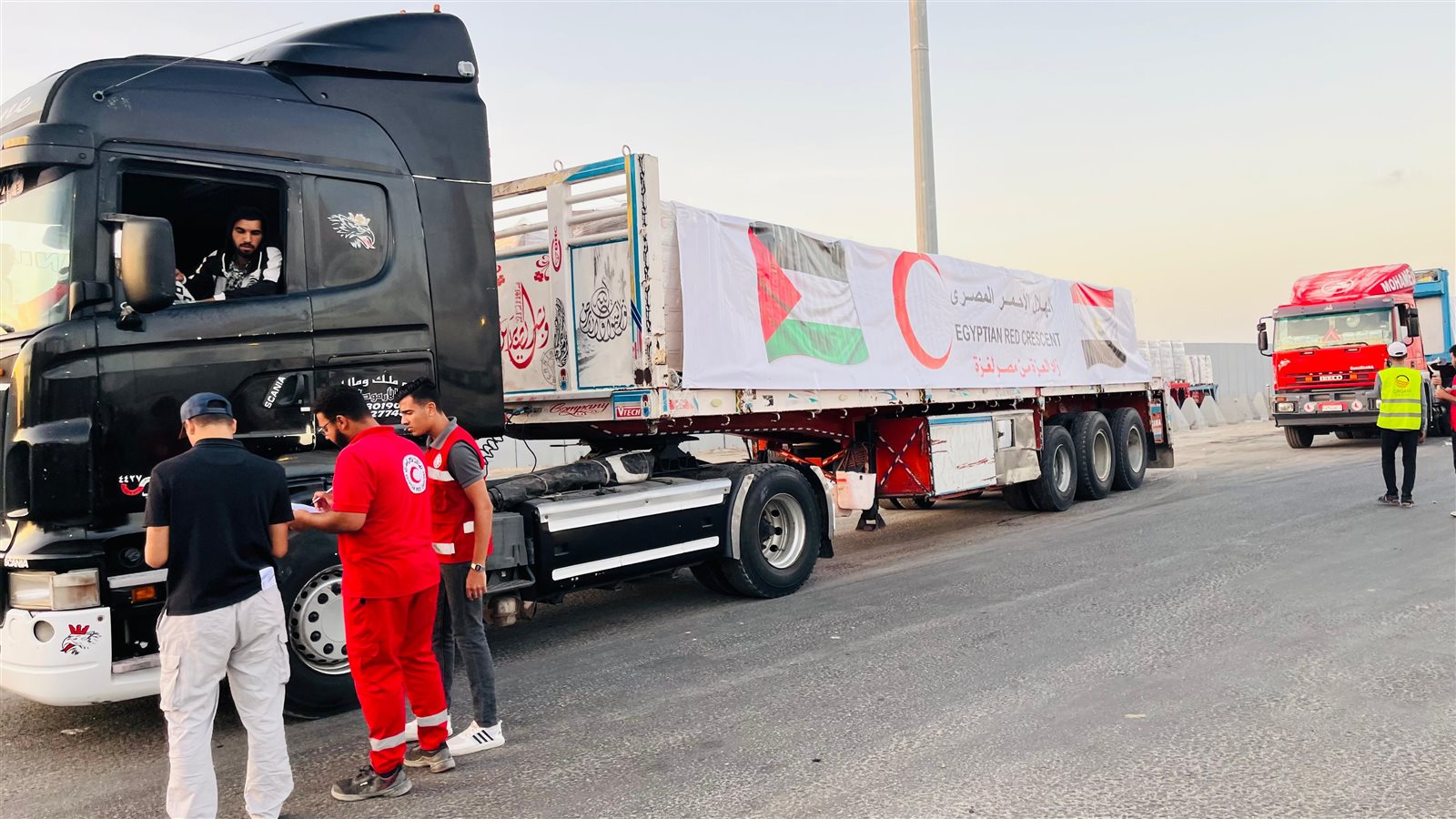 ويتواجد الهلال الأحمر المصري كآلية وطنية لتنسيق وتفويج المساعدات إلى غزة، على الحدود منذ بدء الأزمة حيث لم يتم غلق معبر رفح من الجانب المصري نهائيًا، وواصل تأهبه فى كافة المراكز اللوجستية وجهوده المتواصلة لدخول المساعدات التي بلغت أكثر من نصف مليون طن من المساعدات الإنسانية والإغاثة، وذلك بجهود 35 ألف متطوع بالجمعية.