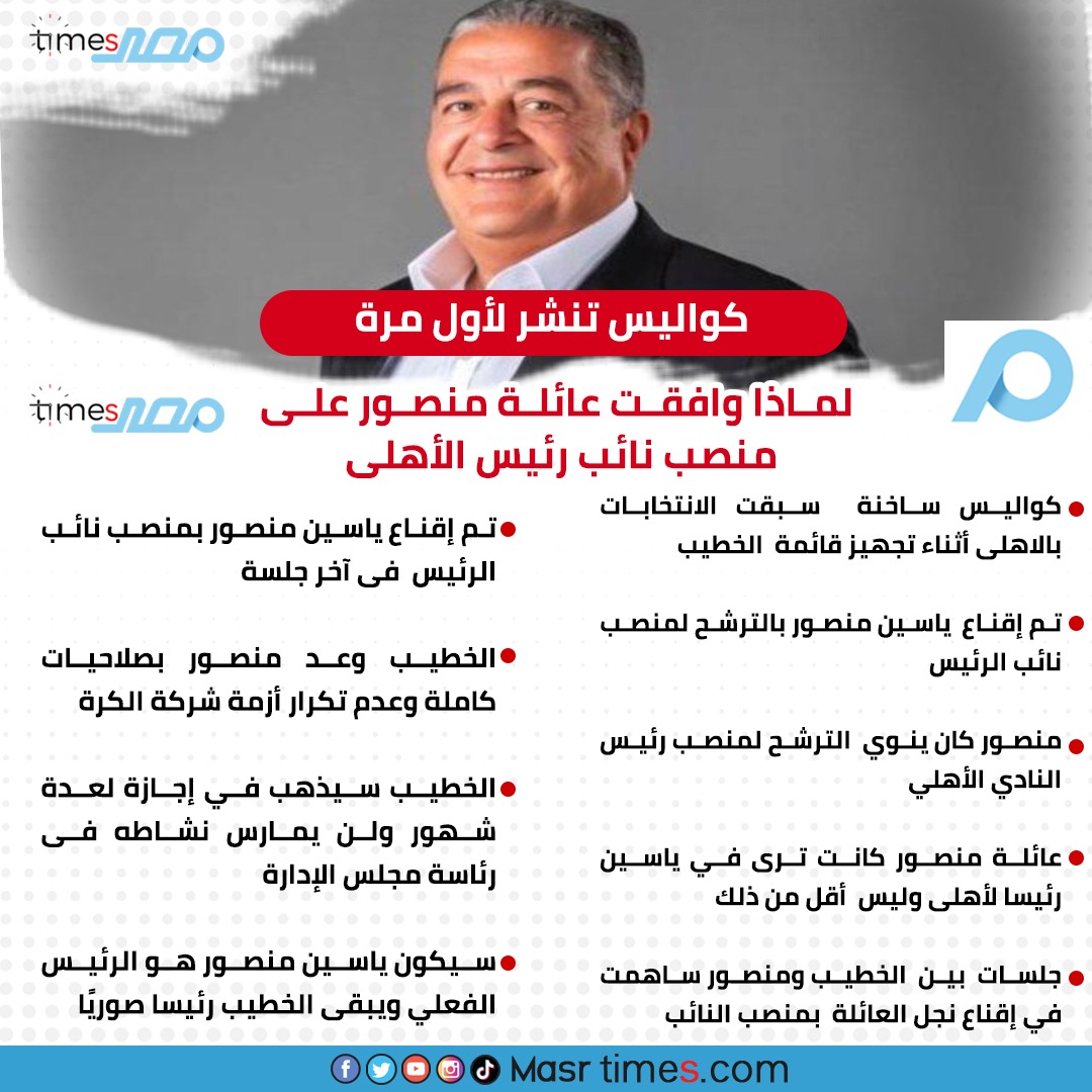 وبحسب مصادر مطلعة، فإن رجل الأعمال ياسين منصور كان ينوي الترشح على منصب رئيس النادي الأهلي، وهو ما اعتبره وعائلته الكبيرة أمرًا طبيعيًا بالنظر إلى قدراته الإدارية ومكانته الاقتصادية كأحد أبرز رجال الأعمال في الشرق الأوسط، إلا أن سلسلة من الجلسات التي قادها كابتن محمود الخطيب نجحت في إقناع نجل العائلة العملاقة بالانضمام إلى القائمة كنائب لرئيس النادي الأهلي.