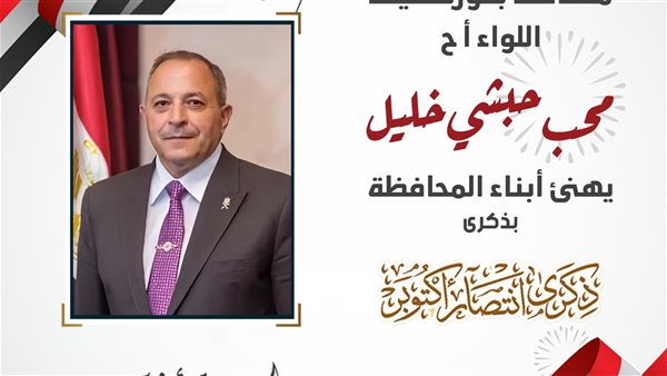 وجه اللواء أ ح / محب حبشي محافظ بورسعيد، أسمى معاني التهنئة القلبية، اليوم، للشعب المصري عامة وأهل محافظة بورسعيد بصفة خاصة، وذلك بمناسبة الذكرى الثانية والخمسين لانتصارات أكتوبر المجيدة، أعادها الله على مصر وابنائها في خير ورخاء و تنمية و استقرار