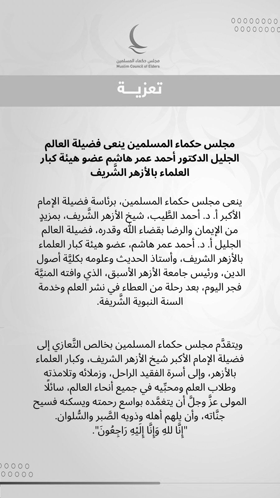 ينعى مجلس حكماء المسلمين، برئاسة فضيلة الإمام الأكبر أ. د. أحمد الطَّيب، شيخ الأزهر الشَّريف، بمزيدٍ من الإيمان والرضا بقضاء الله وقدره، فضيلة العالم الجليل أ. د. أحمد عمر هاشم، عضو هيئة كبار العلماء بالأزهر الشريف، وأستاذ الحديث وعلومه بكليَّة أصول الدين، ورئيس جامعة الأزهر الأسبق، الذي وافته المنيَّة فجر اليوم، بعد رحلة من العطاء في نشر العلم وخدمة السنة النبوية الشَّريفة.