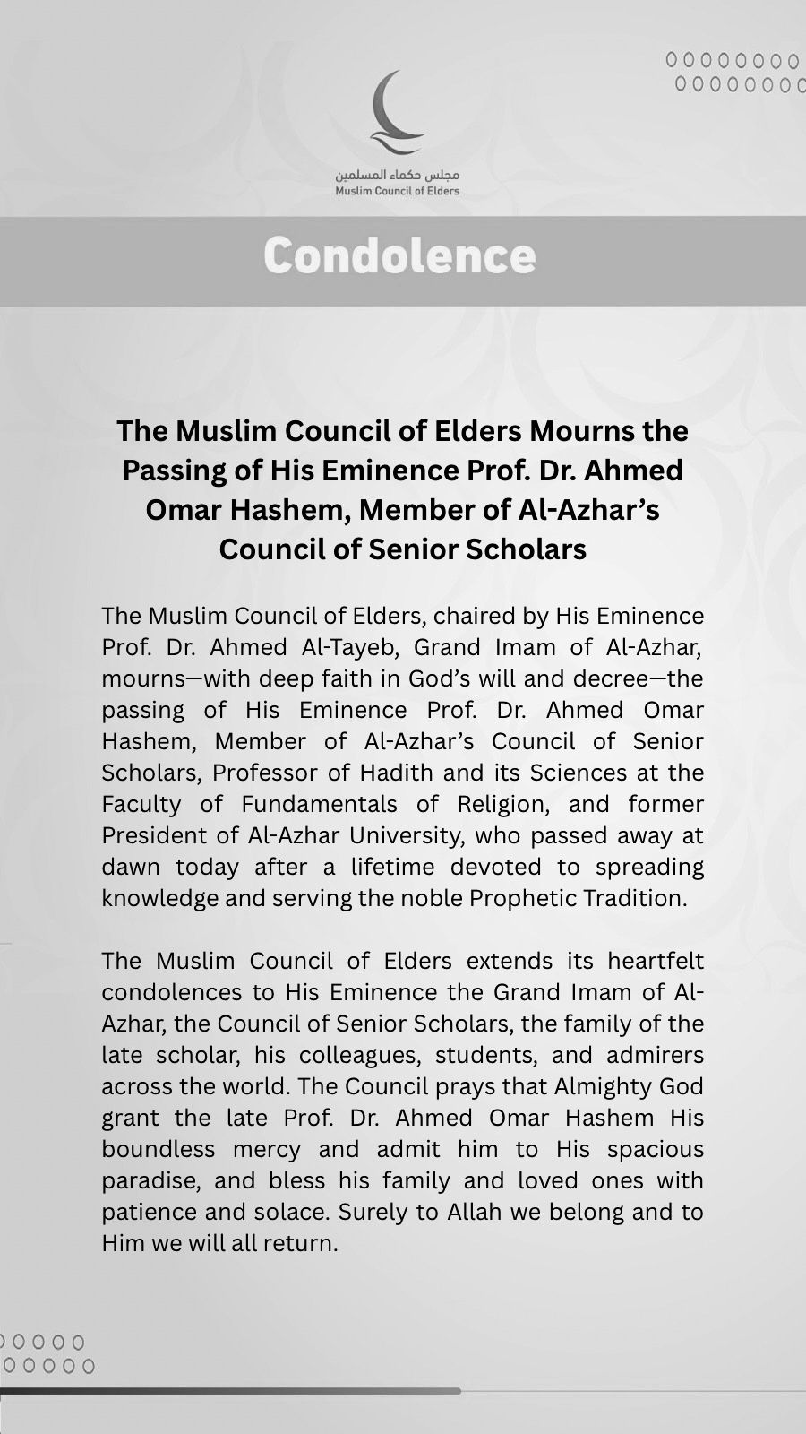 ويتقدَّم مجلس حكماء المسلمين بخالص التَّعازي إلى فضيلة الإمام الأكبر شيخ الأزهر الشريف، وكبار العلماء بالأزهر، وإلى أسرة الفقيد الراحل، وزملائه وتلامذته وطلاب العلم ومحبِّيه في جميع أنحاء العالم، سائلًا المولى عزَّ وجلَّ أن يتغمَّده بواسع رحمته ويسكنه فسيح جنَّاته، وأن يلهم أهله وذويه الصَّبر والسُّلوان.