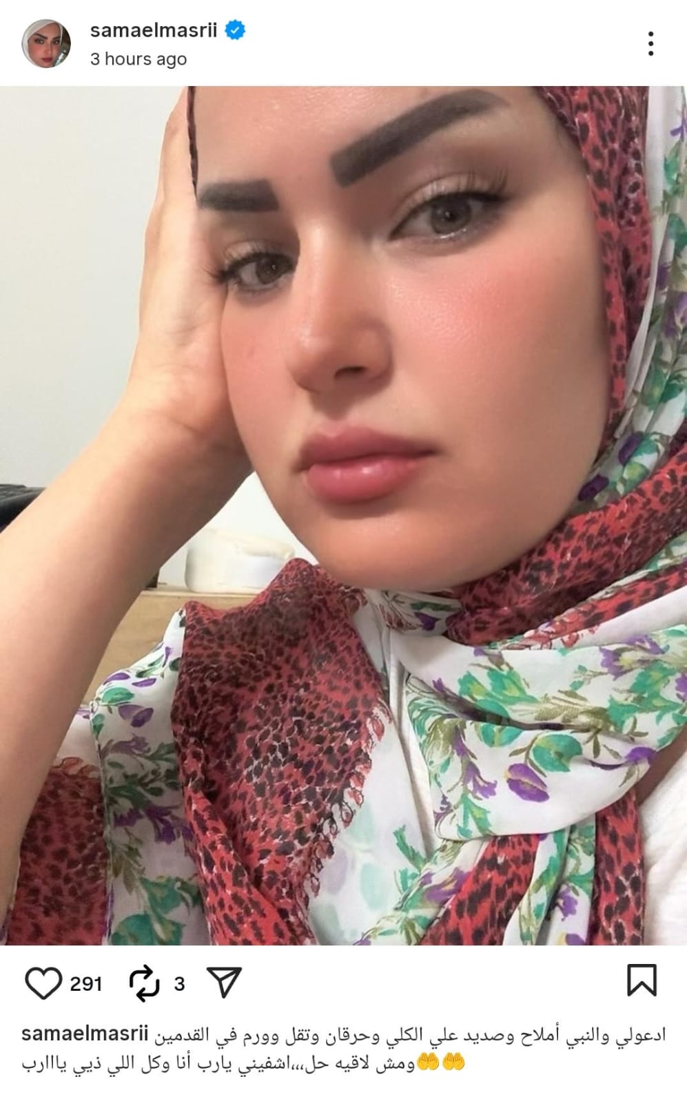 ونشرت سما المصري صورة لها، من خلال حسابها الرسمي عبر موقع تبادل الصور والفيديوهات القصيرة إنستجرام، وكتبت:"ادعولي والنبي أملاح وصديد على الكلى وحرقان وتقل وورم في القدمين ومش لاقية حل.. اشفيني يارب أنا وكل اللي زيي يارب".
