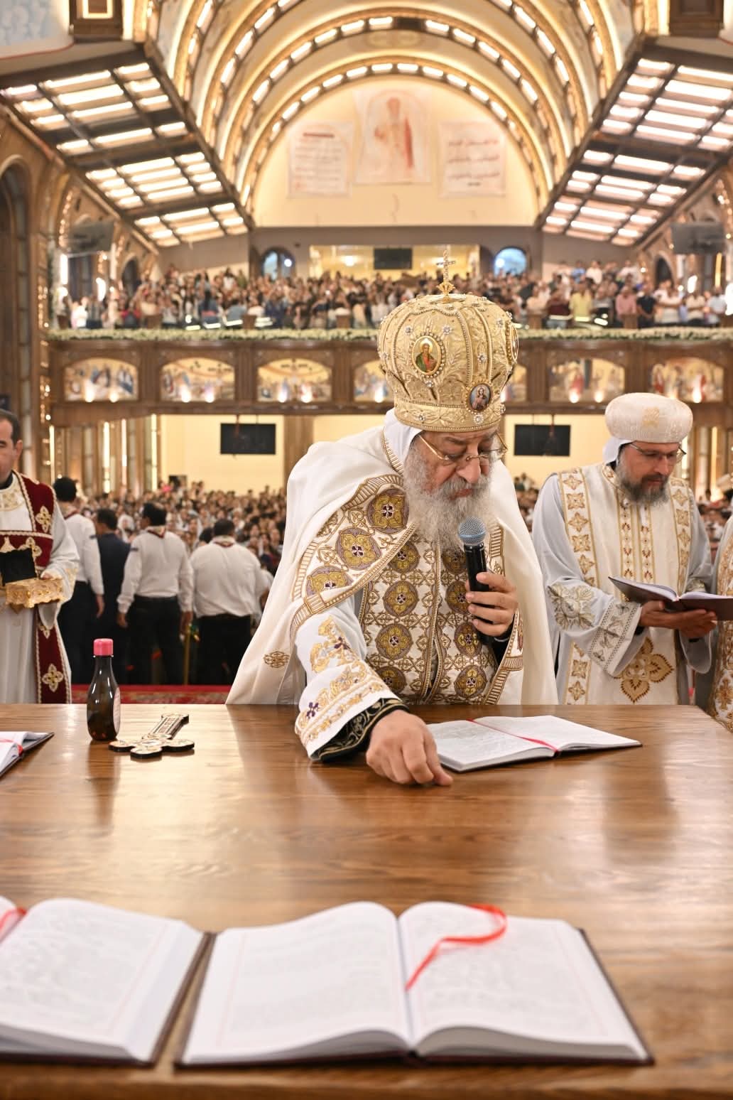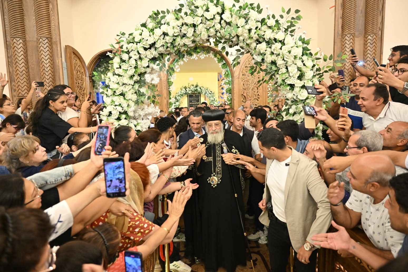 وأزاح قداسته الستار لدى وصوله الكنيسة عن اللوحة التذكارية التي تؤرخ لتدشينها، وقدم طفل وطفلة باقات الورود لقداسة البابا، قبل أن يدخل إلى الكنيسة يتقدمه خورس الشمامسة بالألحان وسط تفاعل ممزوج بالفرحة من قبل الشعب الحاضر.