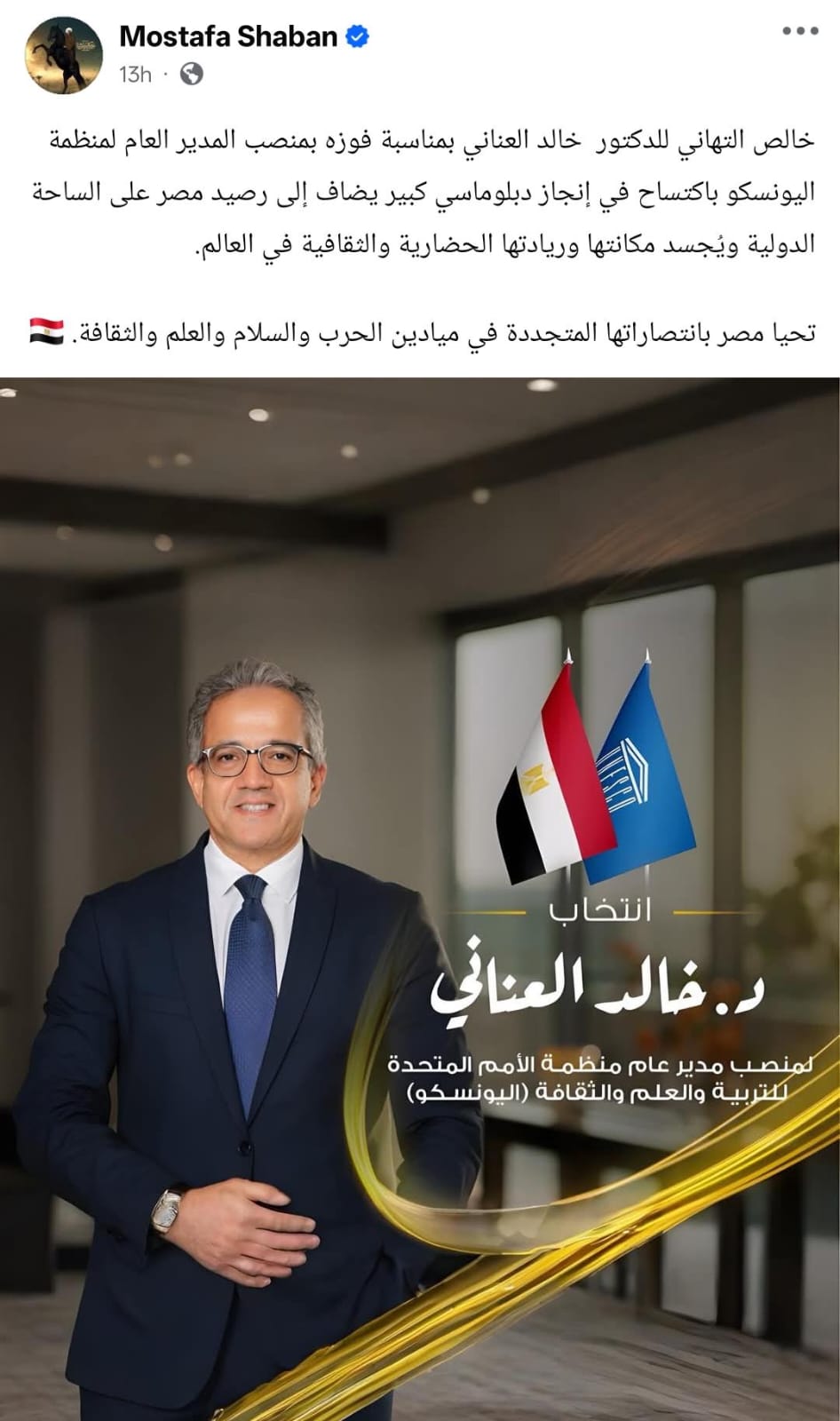 ونشر مصطفى شعبان صورة لـ خالد العناني موجهًا له رسالة داعمة، حيث كتب من خلال حسابه الرسمي عبر موقع التواصل الاجتماعي "فيسبوك"، قال: "خالص التهاني للدكتور خالد العناني بمناسبة فوزه بمنصب المدير العام لمنظمة اليونسكو باكتساح في إنجاز دبلوماسي كبير يضاف إلى رصيد مصر على الساحة الدولية ويُجسد مكانتها وريادتها الحضارية والثقافية في العالم.. تحيا مصر بانتصاراتها المتجددة في ميادين الحرب والسلام والعلم والثقافة".