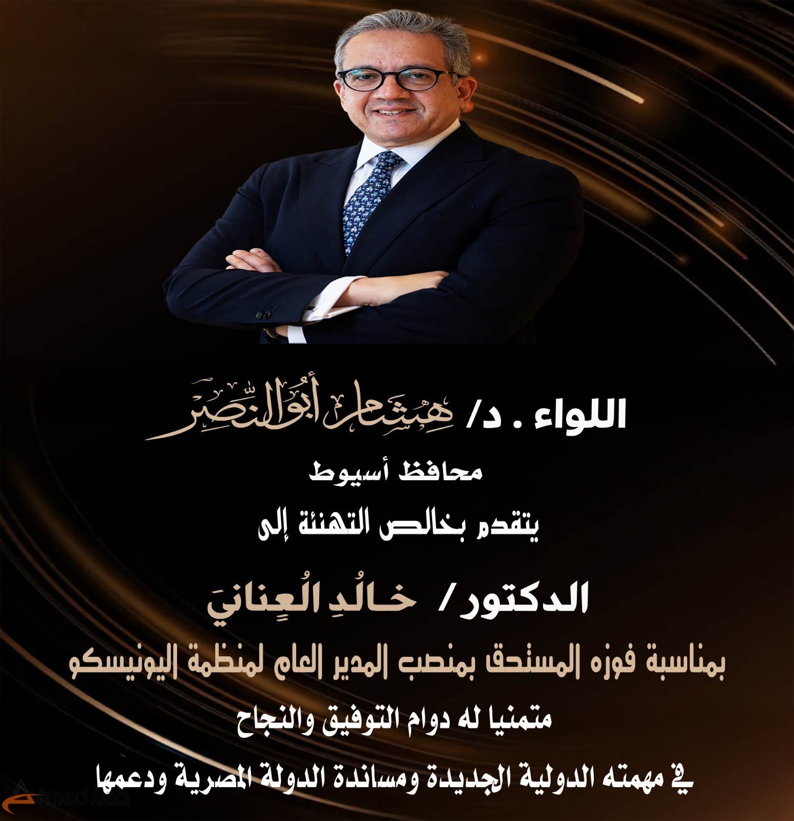 هنأ اللواء دكتور هشام أبو النصر محافظ أسيوط، الدكتور خالد العناني وزير السياحة والآثار الأسبق، بمناسبة فوزه بمنصب المدير العام لمنظمة اليونسكو، بعد حصوله على أغلبية الأصوات في انتخابات المجلس التنفيذي للمنظمة، كأول مصري وعربي يتقلد هذا المنصب الأممي الرفيع، متمنيًا له دوام التوفيق والسداد في مهمته الدولية الجديدة.