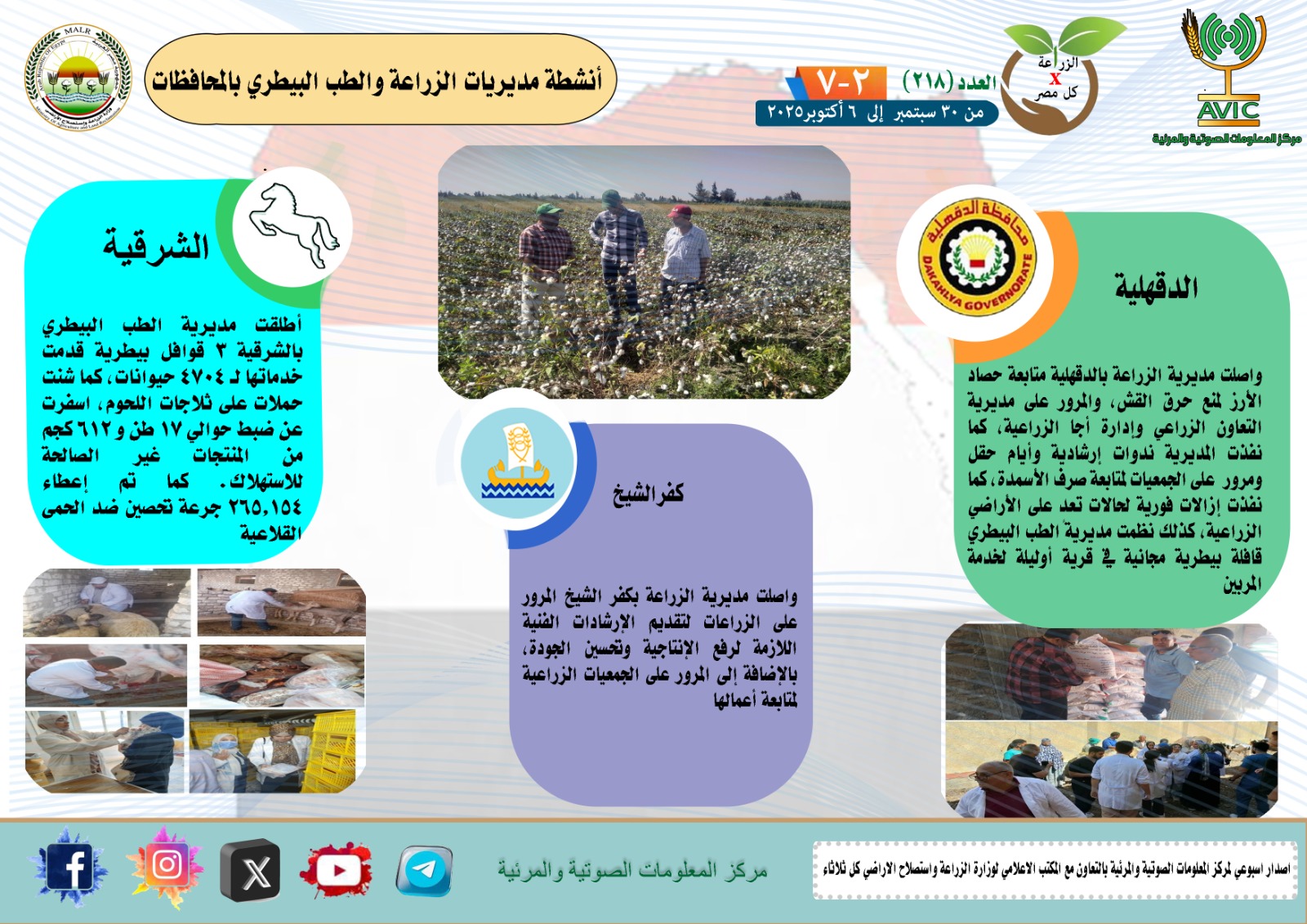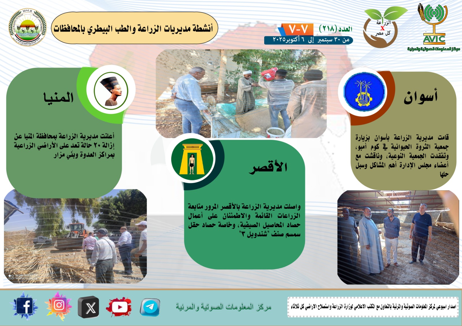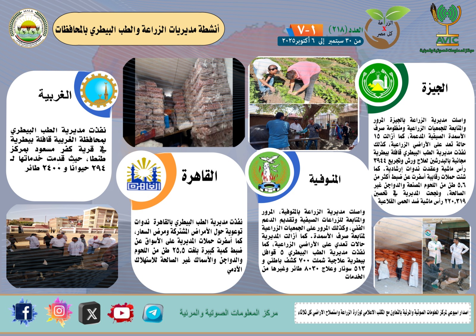 أصدر مركز المعلومات الصوتية والمرئية التابع لوزارة الزراعة واستصلاح الأراضي، والمكتب الاعلامي للوزارة، العدد رقم 218 من اصدار: "الزراعة في كل مصر" بالانفوجراف والفيديو، يوضح الجهود والانشطة التي تقوم بها مديريات الزراعة والطب البيطري بمحافظات الجمهورية خلال الفترة من 30 سبتمبر إلى 6 اكتوبر الجاري.