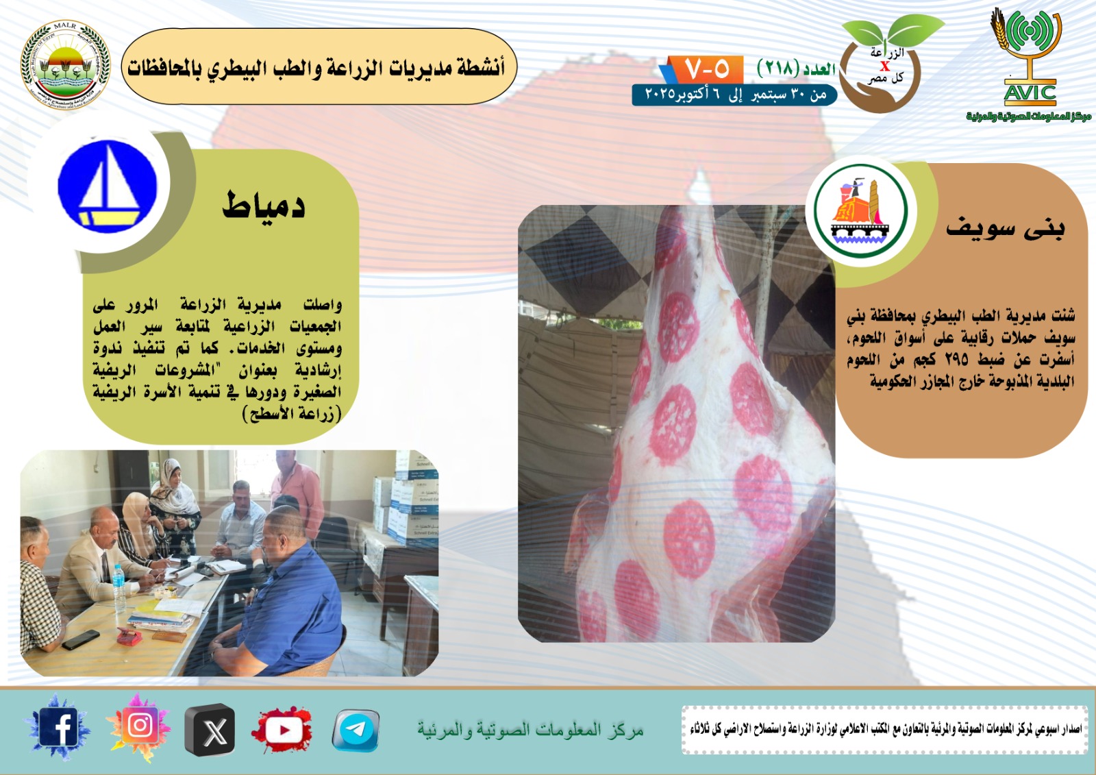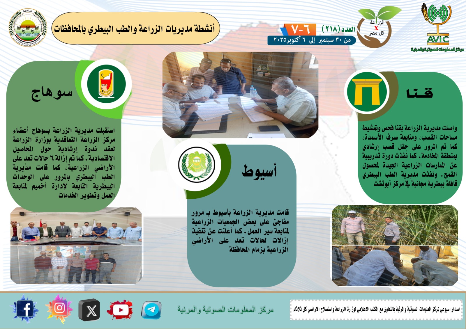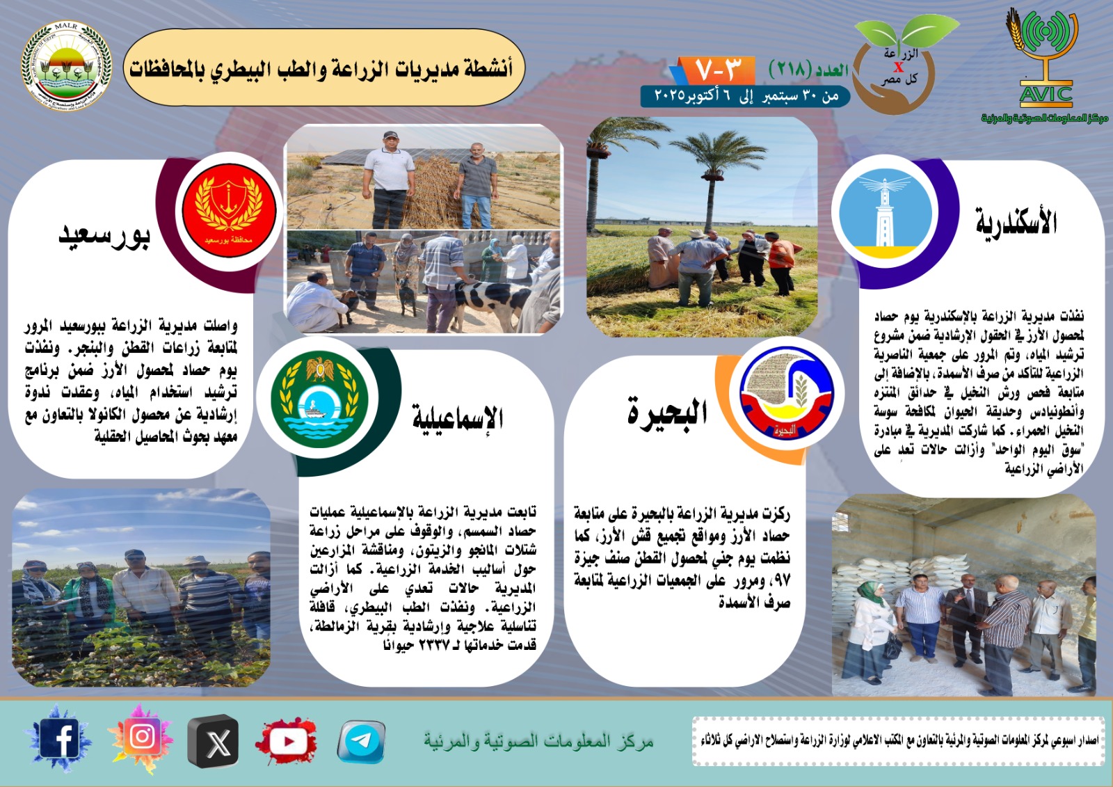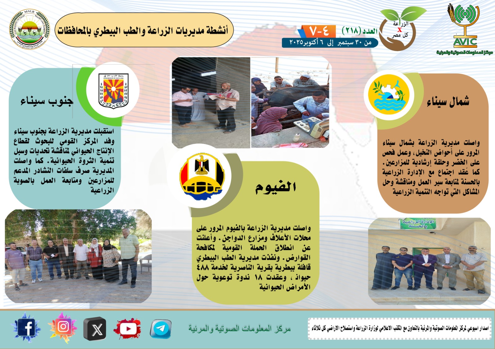 أصدر مركز المعلومات الصوتية والمرئية التابع لوزارة الزراعة واستصلاح الأراضي، والمكتب الاعلامي للوزارة، العدد رقم 218 من اصدار: "الزراعة في كل مصر" بالانفوجراف والفيديو، يوضح الجهود والانشطة التي تقوم بها مديريات الزراعة والطب البيطري بمحافظات الجمهورية خلال الفترة من 30 سبتمبر إلى 6 اكتوبر الجاري.