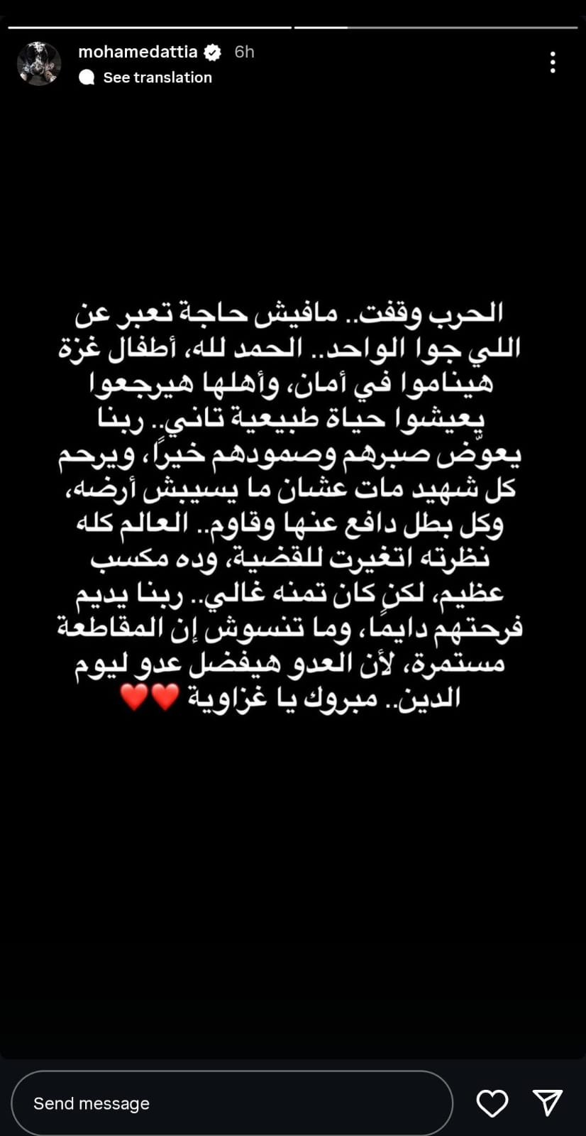 وكتب محمد عطية من خلال حسابه الرسمي عبر موقع تبادل الصور والفيديوهات القصيرة إنستجرام، عبر خاصية ستوري، قال:الحرب وقفت.. مفيش حاجة تعبر عن اللي جوا الواحد.. الحمدلله، أطفال غزة هيناموا في أمان، وأهلها هيرجعوا يعيشوا حياة طبيعية تاني.