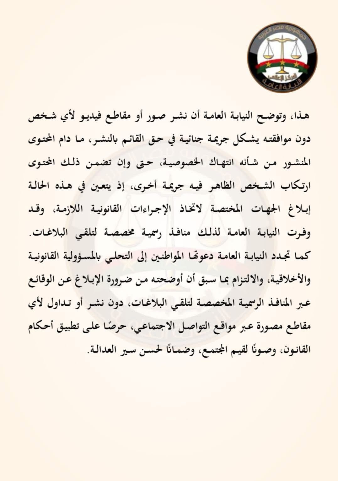 وأكدت النيابة العامة ما سبق أن شددت عليه في بيانات متعددة من ضرورة الامتناع عن نشر أو تداول أي مقاطع مصورة تتضمن انتهاكا لخصوصية أي شخص دون رضاه، لما في ذلك من مخالفة للقانون والقيم الأخلاقية للمجتمع.