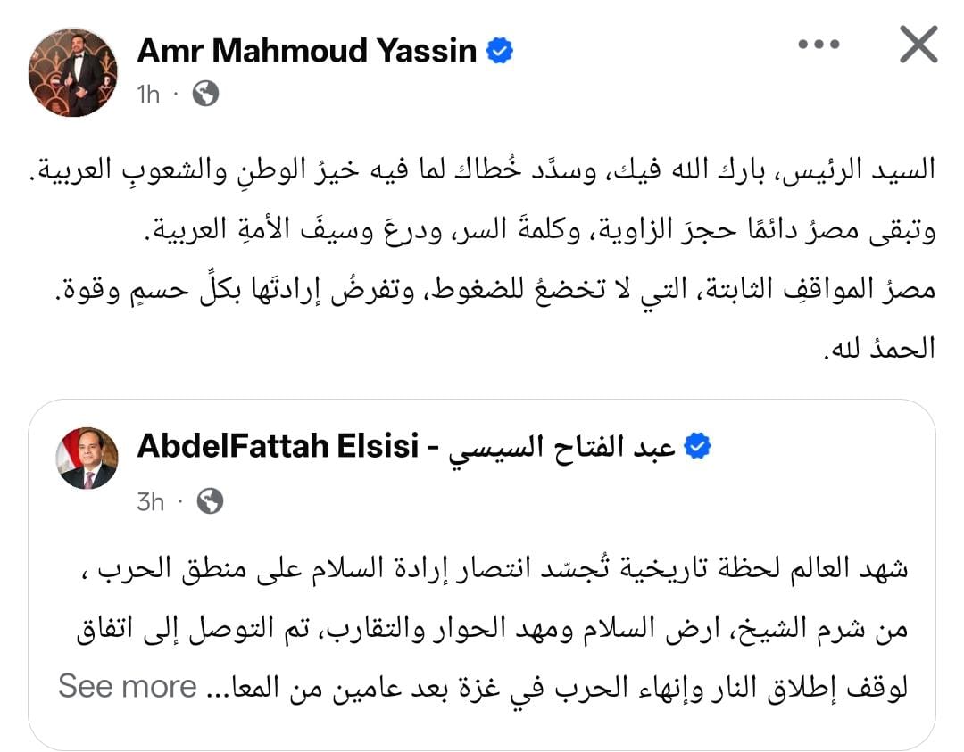 وكتب عمرو محمود ياسين من خلال حسابه الرسمي عبر موقع التواصل الاجتماعي فيسبوك، قال:السيد الرئيس، بارك الله فيك، وسدَّد خُطاك لما فيه خيرُ الوطنِ والشعوبِ العربية.
