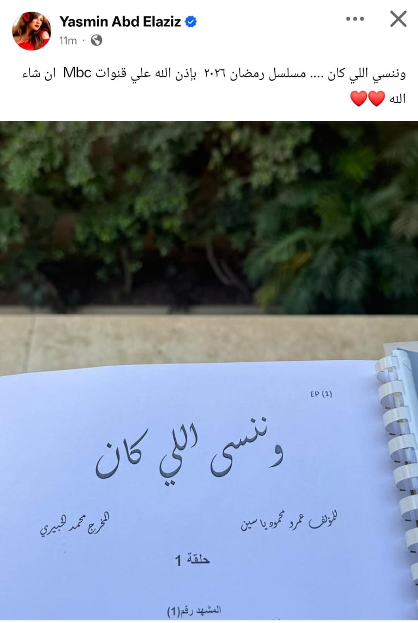 وذلك وفقًا لما أعلنته الفنانة ياسمين عبد العزيز من خلال حسابها الرسمي عبر موقع التواصل الاجتماعي فيسبوك، حيث كتبت: وننسى اللي كان.. مسلسل رمضان 2026 بإذن الله على قنوات Mbc ان شاء الله.