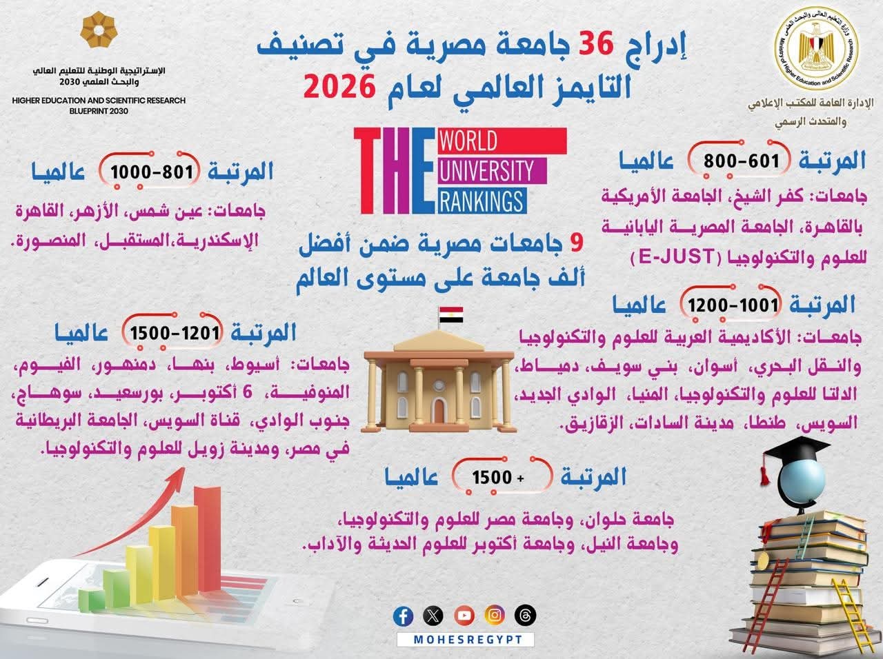 التعليم العالي: إدراج 36 جامعة مصرية في تصنيف التايمز العالمي لعام 2026 ( إنفو جراف)