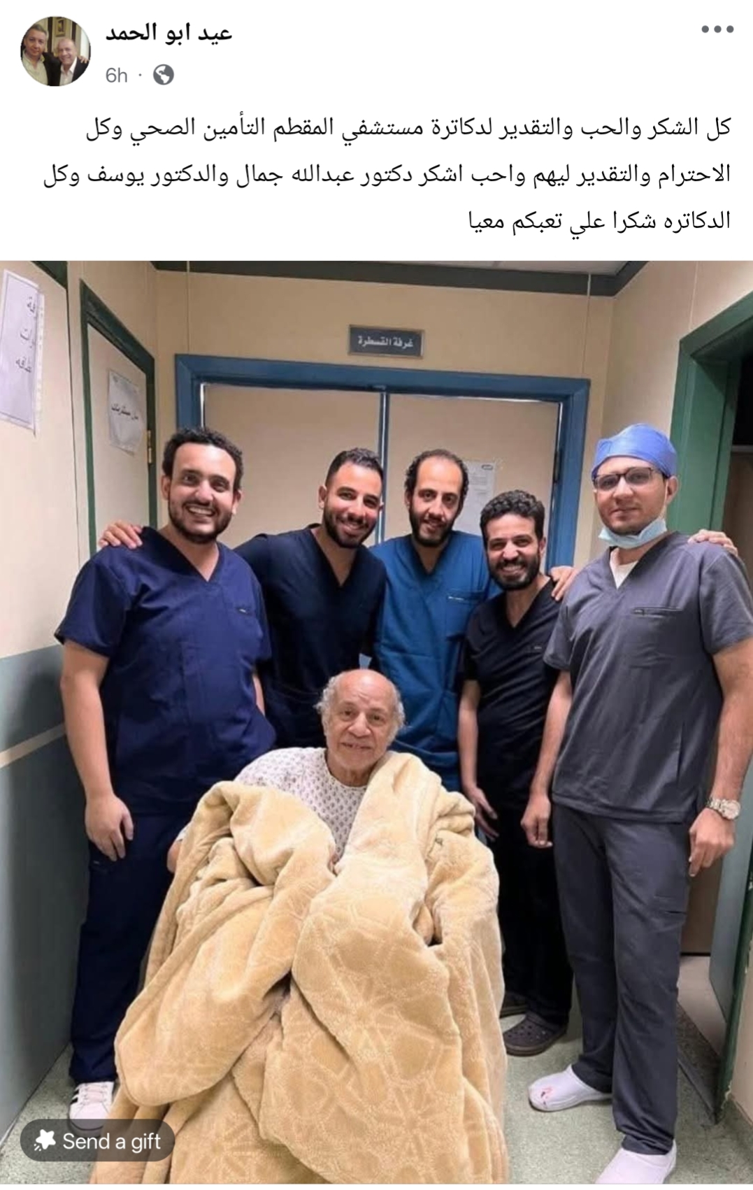 ونشر عيد أبو الحمد صورة تجمعه بالفريق الطبي في أول ظهور له، وكتب من خلال حسابه الرسمي عبر موقع التواصل الاجتماعي فيسبوك، قال: كل الشكر والحب والتقدير لدكاترة مستشفي المقطم التأمين الصحي وكل الاحترام والتقدير ليهم واحب اشكر دكتور عبدالله جمال والدكتور يوسف وكل الدكاتره شكرا علي تعبكم معايا.