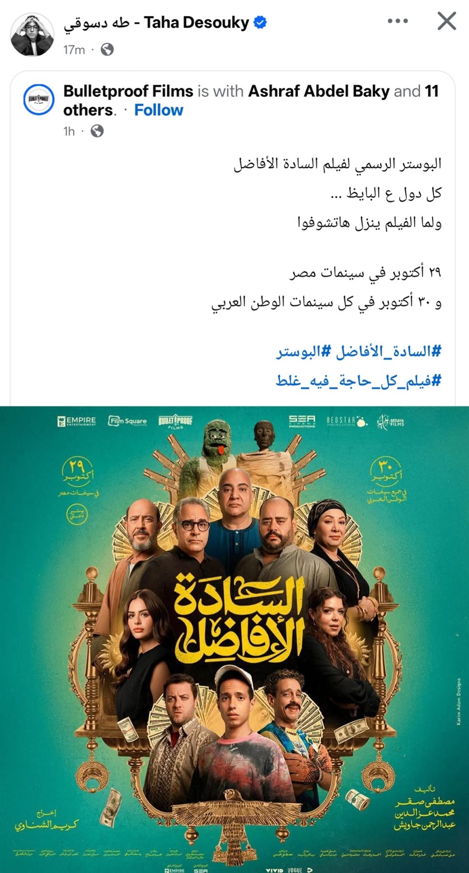 طرح صناع وأبطال فيلم السادة الأفاضل البوستر الرسمي للفيلم، وذلك استعدادًا لعرضه خلال شهر أكتوبر الجاري في دور العرض السينمائي المصري.