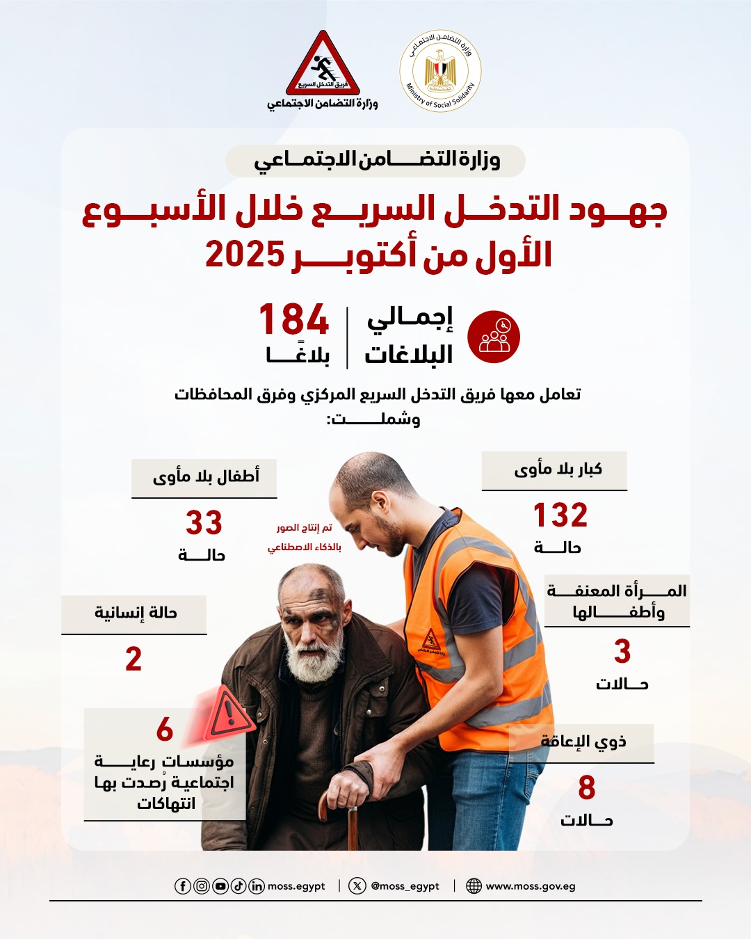 وقد بلغ عدد البلاغات التي تعامل معها فريق التدخل السريع خلال الأسبوع الأول من شهر أكتوبر الجاري نحو 184 بلاغًا متنوعًا، موزعة كالتالي "132 حالة كبار بلا مأوى ، 33 حالة أطفال بلا مأوى ، 3 حالات للمرأة المعنفة وأطفالها بدون مأوى، 2 حالة إنسانية، 8 حالات لذوي الإعاقة، و6 مؤسسات رعاية اجتماعية رُصدت بها انتهاكات" .