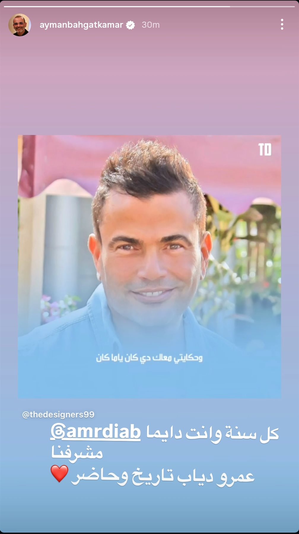 ونشر أيمن بهجت قمر صورة لـ عمرو دياب ووجه له بعض الكلمات، وذلك من خلال حسابه الرسمي عبر موقع تبادل الصور والفيديوهات القصيرة إنستجرام، عبر خاصية ستوري، وقال: كل سنة وأنت دايمًا مشرفنا.. عمرو دياب تاريخ وحاضر.