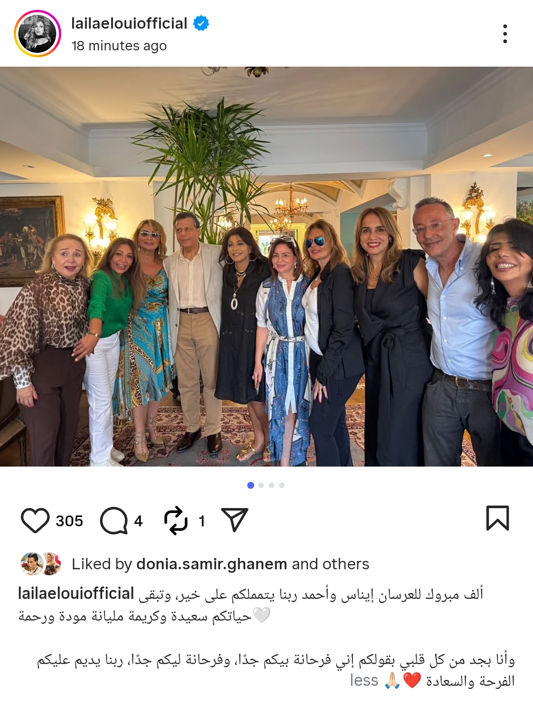 ونشرت ليلى علوي صور تجمعها بهم، وذلك من خلال حسابها الرسمي عبر موقع تبادل الصور والفيديوهات القصيرة إنستجرام، وكتبت: ألف مبروك للعرسان إيناس وأحمد ربنا يتمملكم على خير، وتبقى حياتكم سعيدة وكريمة مليانة مودة ورحمة.