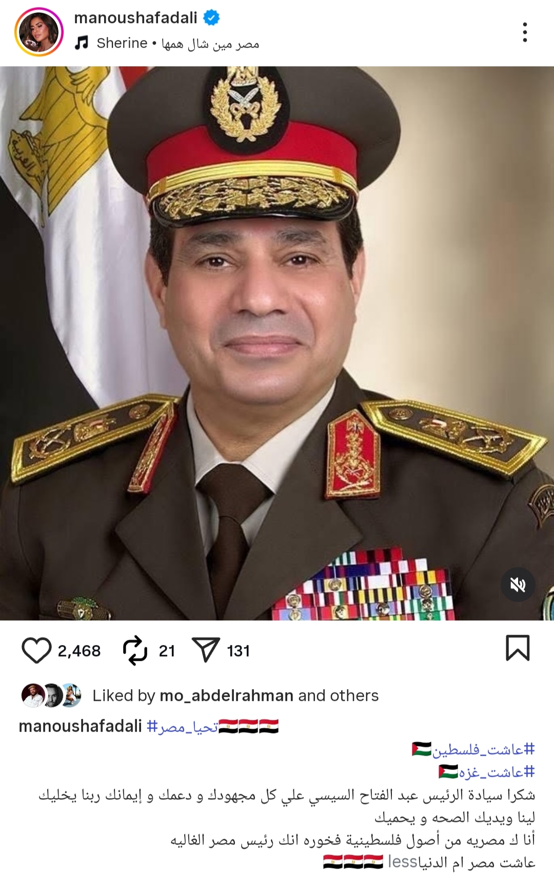 نشرت الفنانة منة فضالي عبر حسابها الرسمي على موقع تبادل الصور والفيديوهات القصيرة انستجرام رسالة وجهتها للرئيس عبد الفتاح السيسي قالت فيها: شكراً سيادة الرئيس عبد الفتاح السيسي على كل مجهودك ودعمك.. ربنا يخليك لينا ويديك الصحة ويحميك.. أنا كمصرية من أصول فلسطينية فخورة إنك رئيس مصر الغالية.. عاشت مصر أم الدنيا، والمنشور حظي بتفاعل كبير من متابعيها، الذين شاركوها الإعجاب بجهود الدولة المصرية في إنهاء التصعيد العسكري ودعمها المستمر للقضية الفلسطينية.