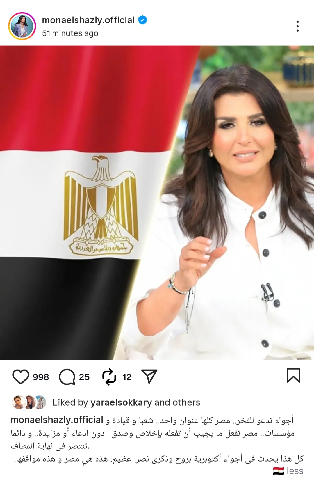 وكتبت منى الشاذلي من خلال حسابها الرسمي عبر موقع تبادل الصور والفيديوهات القصيرة إنستجرام، وقالت: أجواء تدعو للفخر.. مصر كلها عنوان واحد.. شعبا و قيادة و مؤسسات.. مصر تفعل ما يجيب أن تفعله بإخلاص وصدق.. دون ادعاء أو مزايدة.. و دائما تنتصر فى نهاية المطاف.