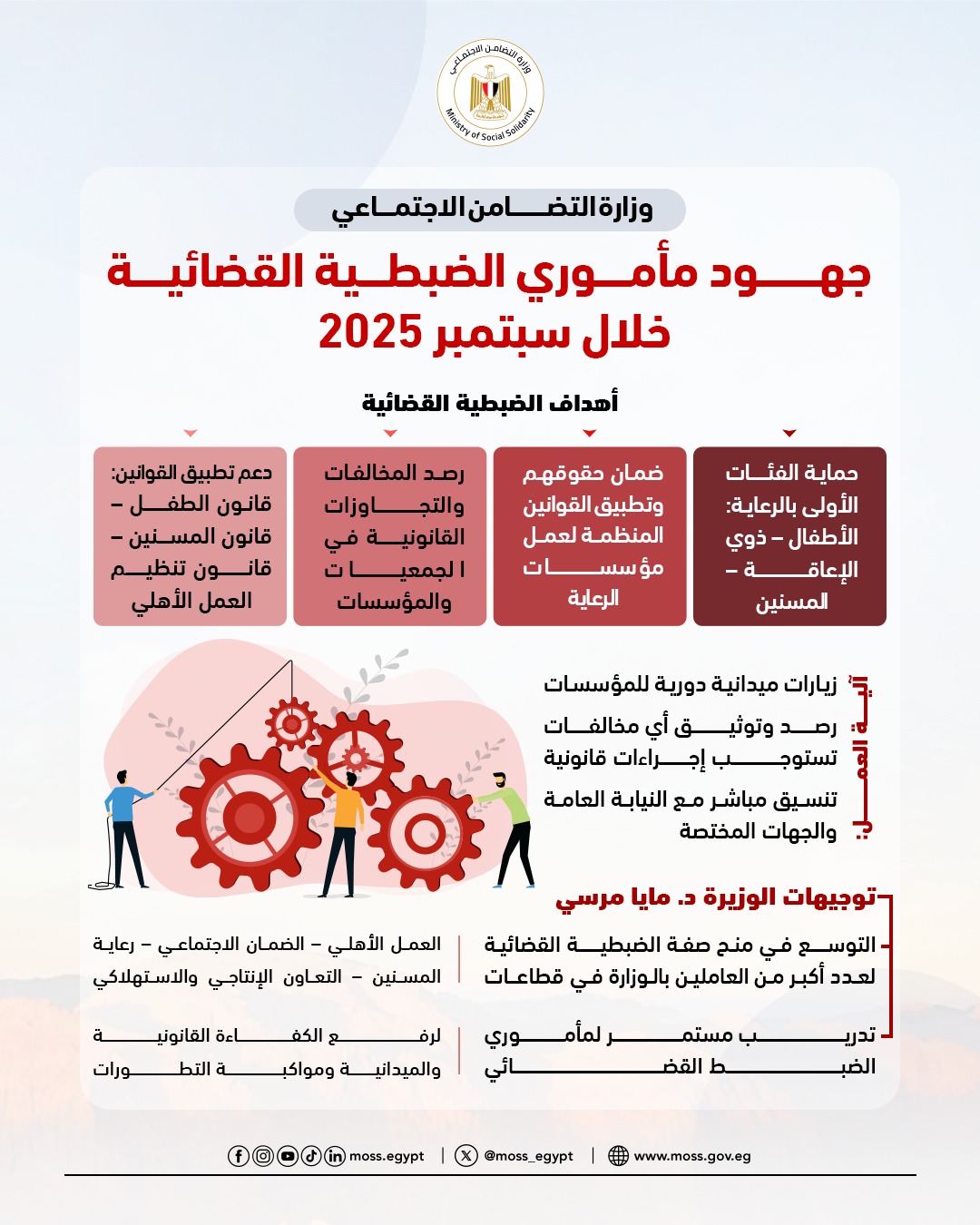 الجدير بالذكر أن الضبطية القضائية بوزارة التضامن الاجتماعي هي آلية رقابية وقانونية تُمكّن مأموري الضبط القضائي من حماية الفئات الأولى بالرعاية "مثل الأطفال وذوي الإعاقة والمسنين" وضمان حقوقهم من خلال الرقابة على مؤسسات الرعاية الاجتماعية، وكشف المخالفات والتجاوزات، وتحرير محاضر قضائية بشأنها بالتنسيق مع الجهات المختصة.