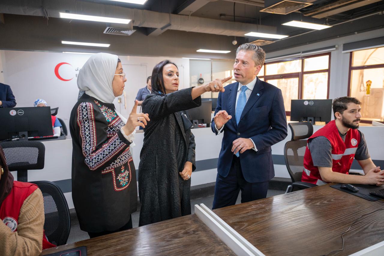 وعقب ذلك اصطحبت وزيرة التضامن الاجتماعي وكيل الأمين العام للشئون الإنسانية ومنسق الإغاثة في حالات الطوارئ في جولة داخل غرفة العمليات المركزية بمقر المركز العام للهلال الأحمر المصري، للإطلاع ومتابعة آلية تنسيق المساعدات على مدار الساعة وعمل المتطوعين داخل الغرفة.