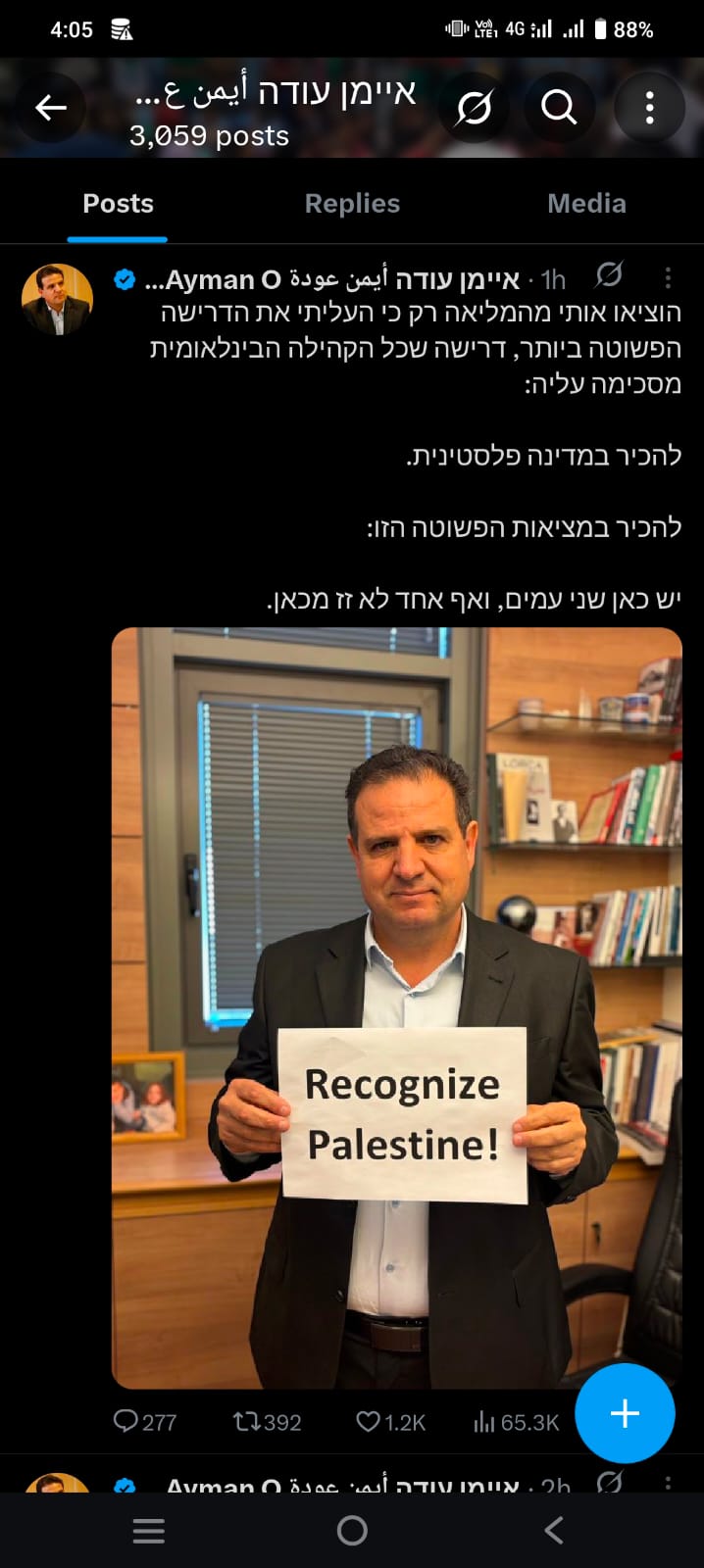قبل ذلك بنحو ساعة، كتب عودة في تغريدة أخرى عبر فيها عن استيائه من الجلسة ووصفها بأنها مليئة بـالنفاق الذي لا يُطاق، وكتب أن تخليد نتنياهو بالإطراء لا يُعفيه ولا حتى حكومته من جرائم الحرب المرتكبة في غزة، أو من المسؤولية عن دماء مئات الآلاف من الضحايا الفلسطينيين والإسرائيليين، مؤكداً أن مطالبته بـإنهاء الاحتلال والاعتراف بدولة فلسطين إلى جانب إسرائيل، هي الطريق نحو العدالة والسلام والأمن للجميع.