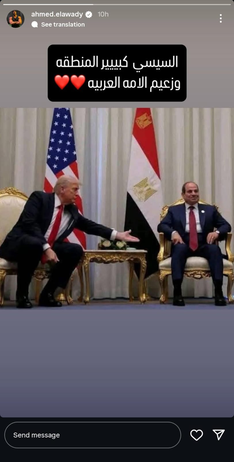 ونشر أحمد العوضي صورة تجمع الرئيس السيسي ودونالد ترامب، من خلال حسابه الرسمي عبر موقع تبادل الصور والفيديوهات القصيرة إنستجرام، عبر خاصية ستوري، وكتب: السيسي كبير المنطقة وزعيم الأمة العربية.