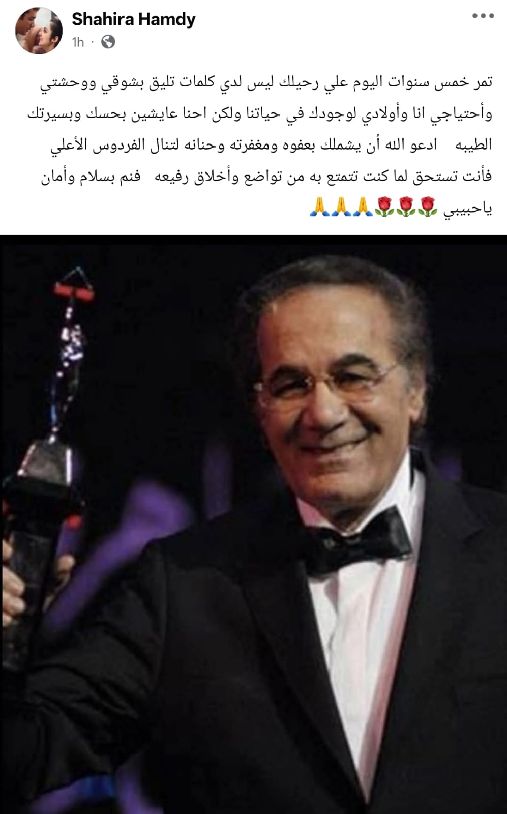 ونشرت شهيرة صورة للفنان محمود ياسين، من خلال حسابها الرسمي عبر موقع التواصل الاجتماعي فيسبوك، وكتبت: تمر خمس سنوات اليوم علي رحيلك ليس لدي كلمات تليق بشوقي ووحشتي وأحتياجي انا وأولادي لوجودك في حياتنا ولكن احنا عايشين بحسك وبسيرتك الطيبه.