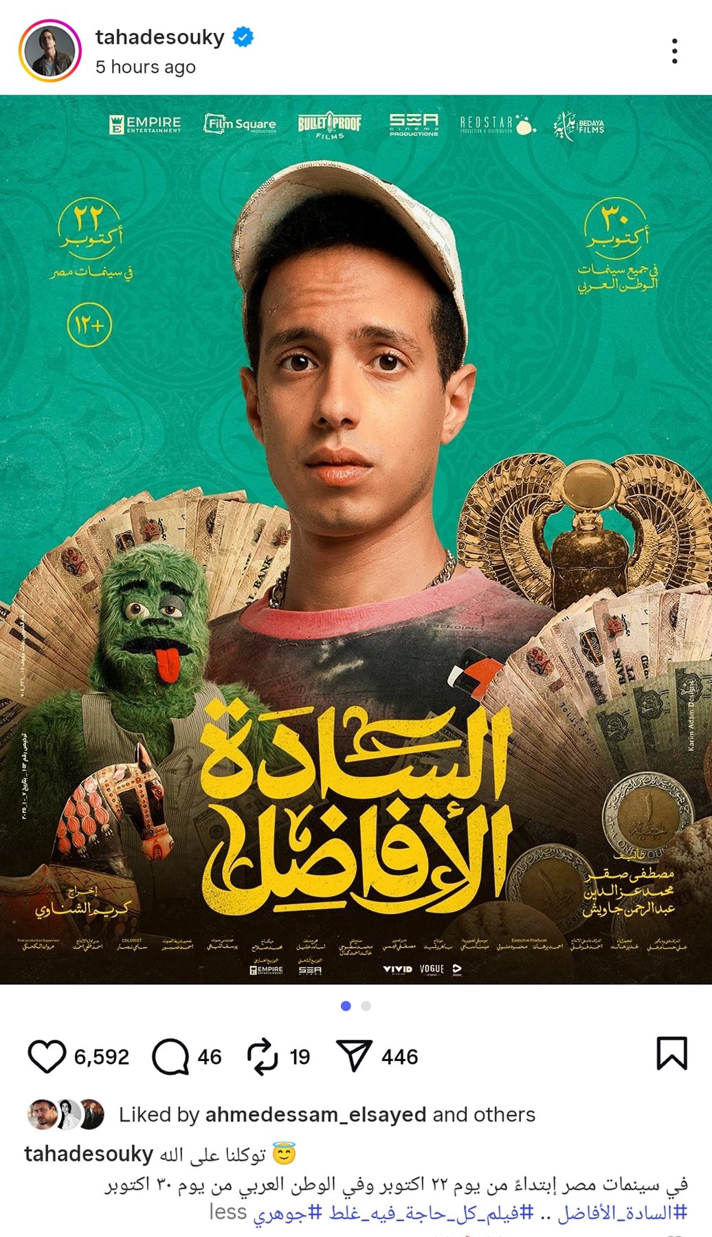 وكتب طه دسوقي: توكلنا على الله.. في سينمات مصر إبتداءً من يوم ۲۲ اكتوبر وفي الوطن العربي من يوم ٣٠ اكتوبر.