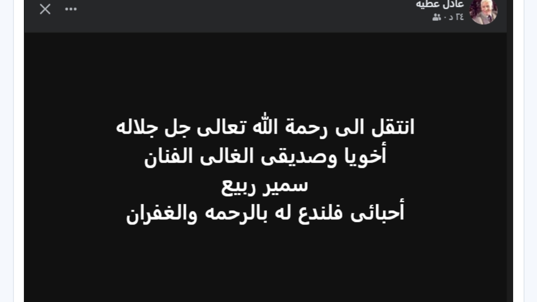 وكتب عادل عطية من خلال حسابه الشخصي على موقع التواصل الاجتماعي فيسبوك : انتقل إلى رحمة الله تعالى جل جلاله .. أخويا وصديقي الغالي الفنان سمير ربيع .. أحبائي فلندع به بالرحمة والغفران.