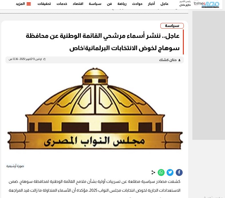 تأكيدا لـ "مصر تايمز".. أسماء مرشحي القائمة الوطنية بسوهاج في انتخابات النواب 2025