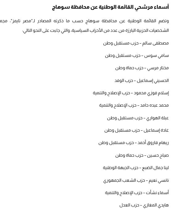 وانفرد"مصر تايمز" منذ يومين بنشر الأسماء التالية المرشحة ضمن القائمة عن دائرة محافظة سوهاج: