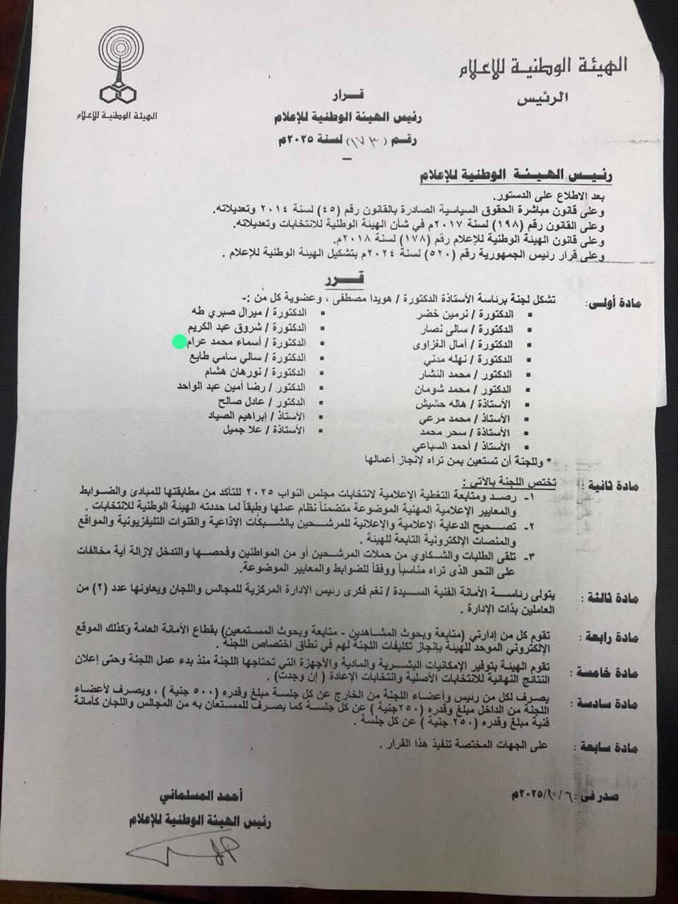 ونص القرار على أن للجنة الاستعانة بمن تراه مناسبًا من الخبراء أو المتخصصين لإنجاز أعمالها، بما يضمن تحقيق أعلى درجات المهنية والموضوعية في متابعة الأداء الإعلامي خلال فترة الانتخابات.