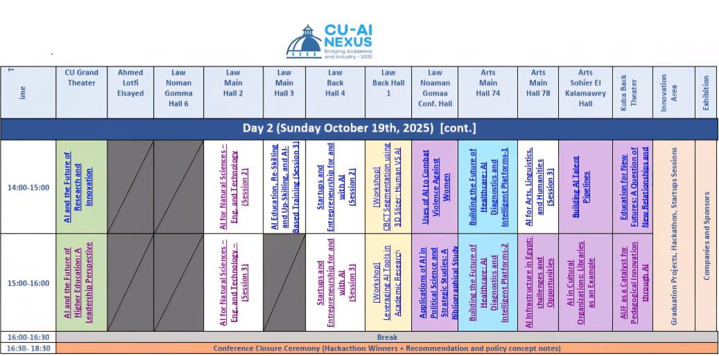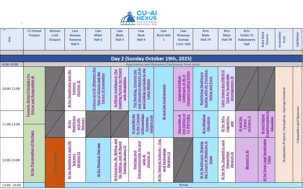 وفي اليوم الثاني، الأحد 19 أكتوبر، تتواصل فعاليات المؤتمر بعقد 45جلسة متخصصة تغطي تطبيقات الذكاء الاصطناعي في مختلف المجالات. وتشمل قضايا مهمة أبرزها: المبادئ العالمية للاستخدام الأخلاقي والمسئول لتطبيقات الذكاء الاصطناعي، والشركات الناشئة وريادة الأعمال بالاعتماد على الذكاء الاصطناعي، ومناقشة النسخة الثانية من سياسة الملكية الفكرية لجامعة القاهرة، واستخدام الذكاء الاصطناعي في البحث العلمي وفي التدريب لإعادة تأهيل المهارات وتطويرها، واستخدام الذكاء الاصطناعي لخدمة الفنون واللغويات والعلوم الإنسانية، واستخدامات الذكاء الاصطناعي للمساعدة في مناهضة العنف ضد المرأة، والذكاء الاصطناعي والتحول الرقمي، والتحديات القانونية والأخلاقية لاستخداماته، وإعادة تعريف جودة الرعاية الصحية بعد استخدام تطبيقات الذكاء الاصطناعي، وإنشاء مدن ذكية ومستدامة.